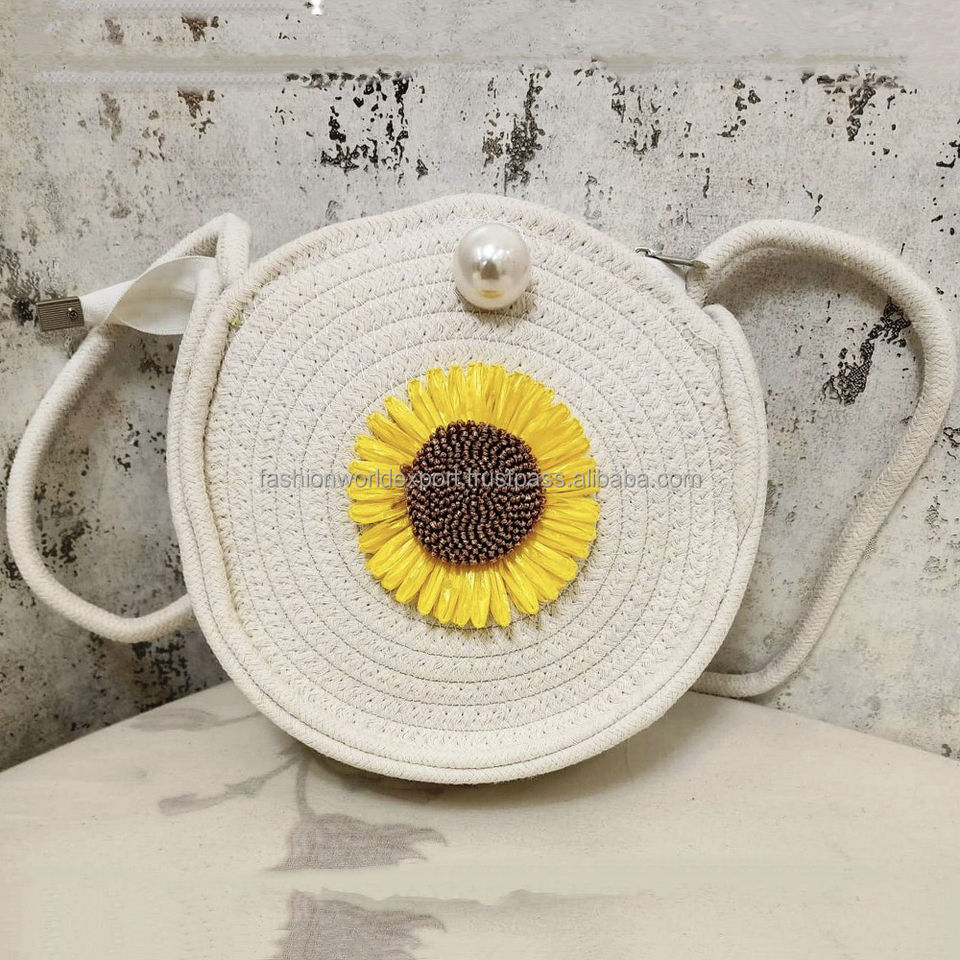 กระเป๋าเชือกสีเขียวมะกอกสไตล์โบฮีเมียนสำหรับผู้หญิงกระเป๋าคาดลำตัวทรงกลมลายดอกทานตะวันประดับลูกปัดกระเป๋าผ้าฝ้ายทำด้วยมือลายดอกไม้มีมุกปิด