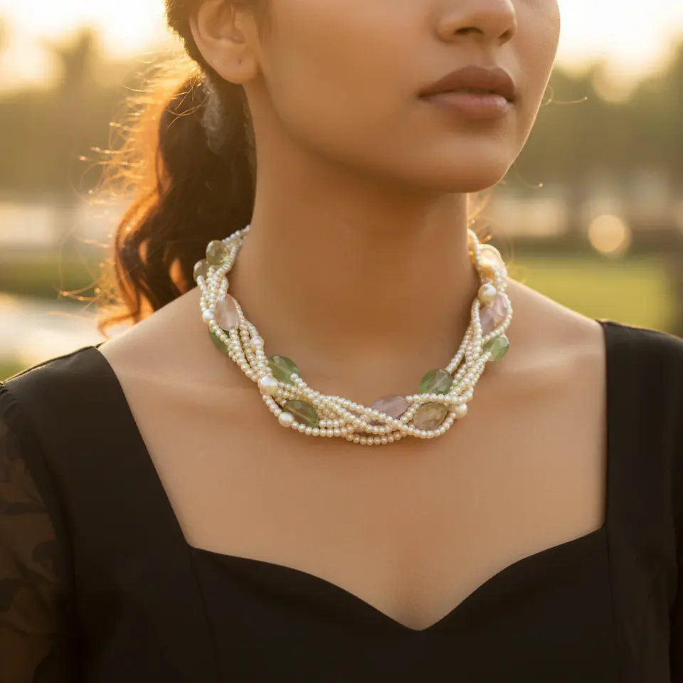 สร้อยคอถักสไตล์โบฮีเมียนและศาสนาประดับมุกน้ำจืดและอัญมณี สร้อยคอแฟชั่น เครื่องประดับโดดเด่นสำหรับผู้หญิง ของขวัญทางศาสนา