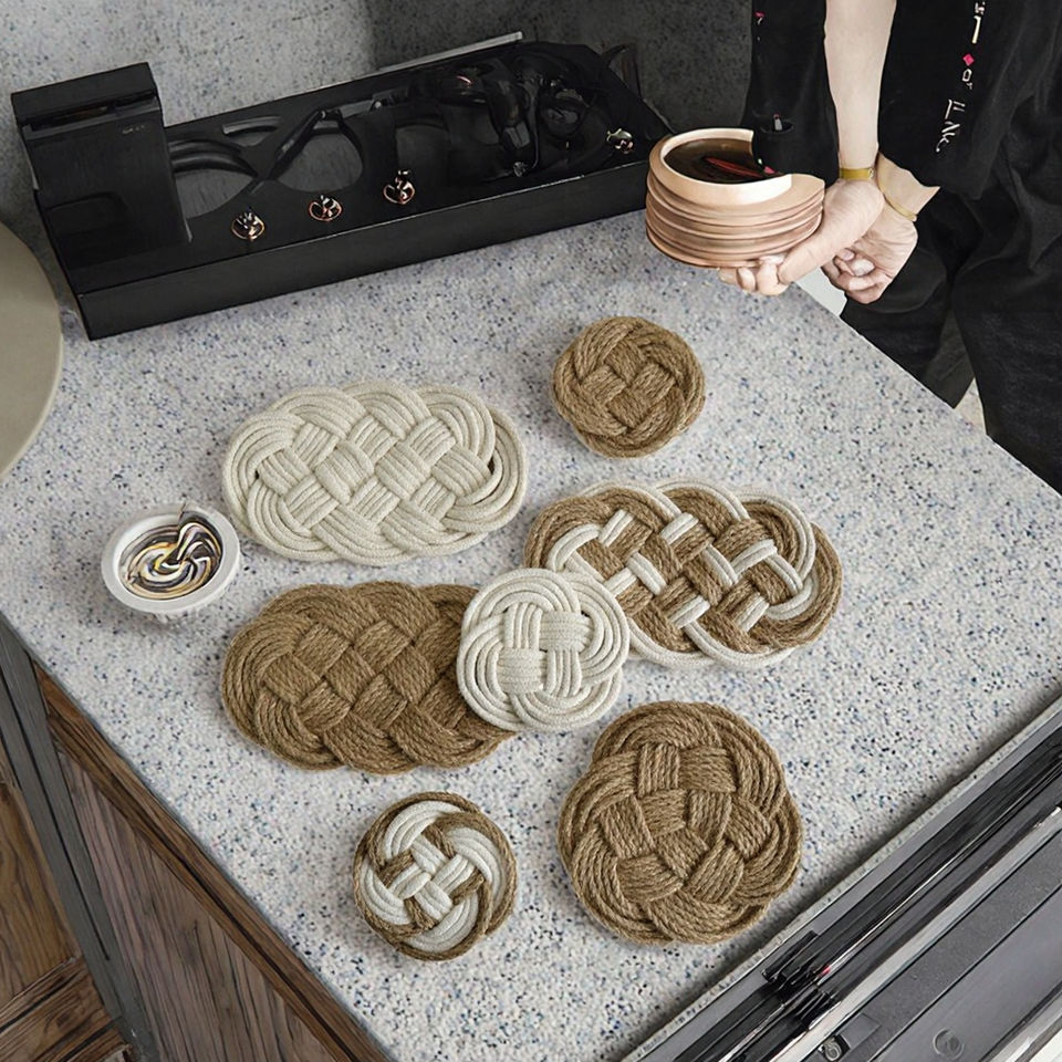 แผ่นรองจานแบบถักสไตล์โบฮีเมียน ทำจากโพลีเอสเตอร์ผสมฝ้าย ทนความร้อน กันลื่น หนา 8 มม.