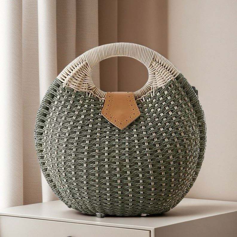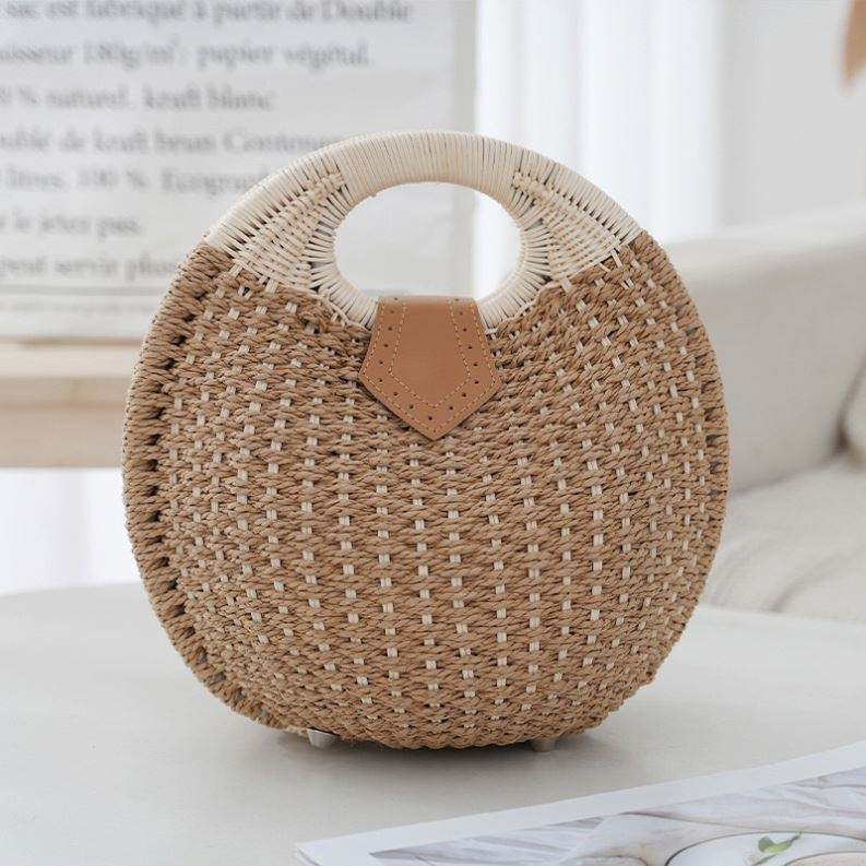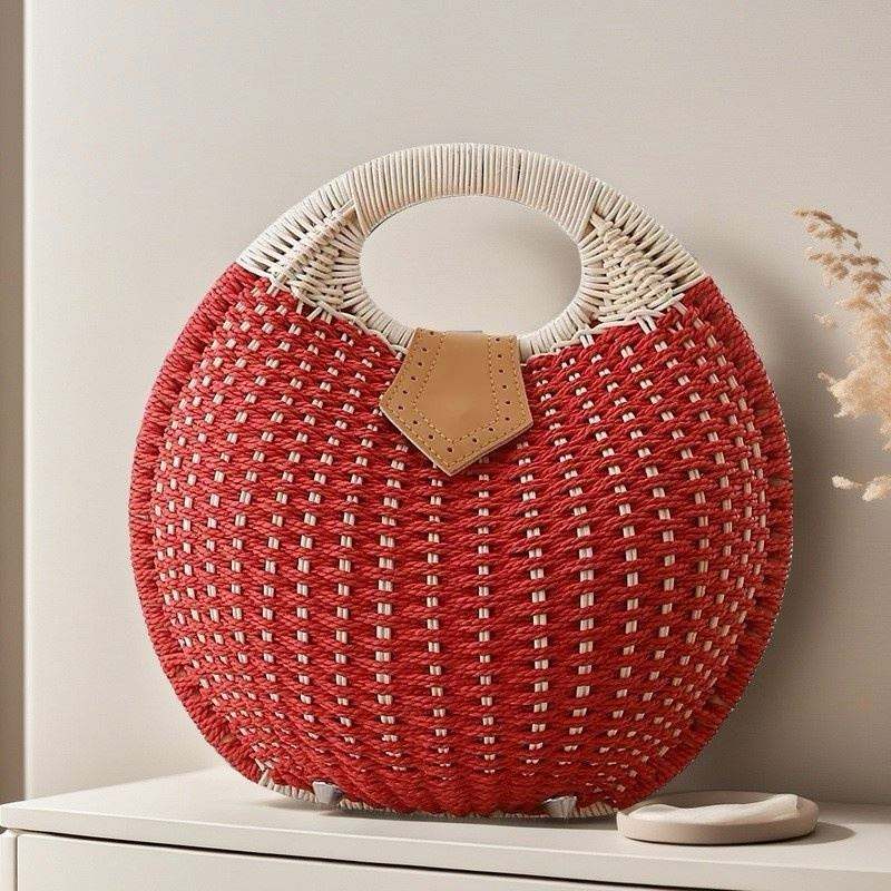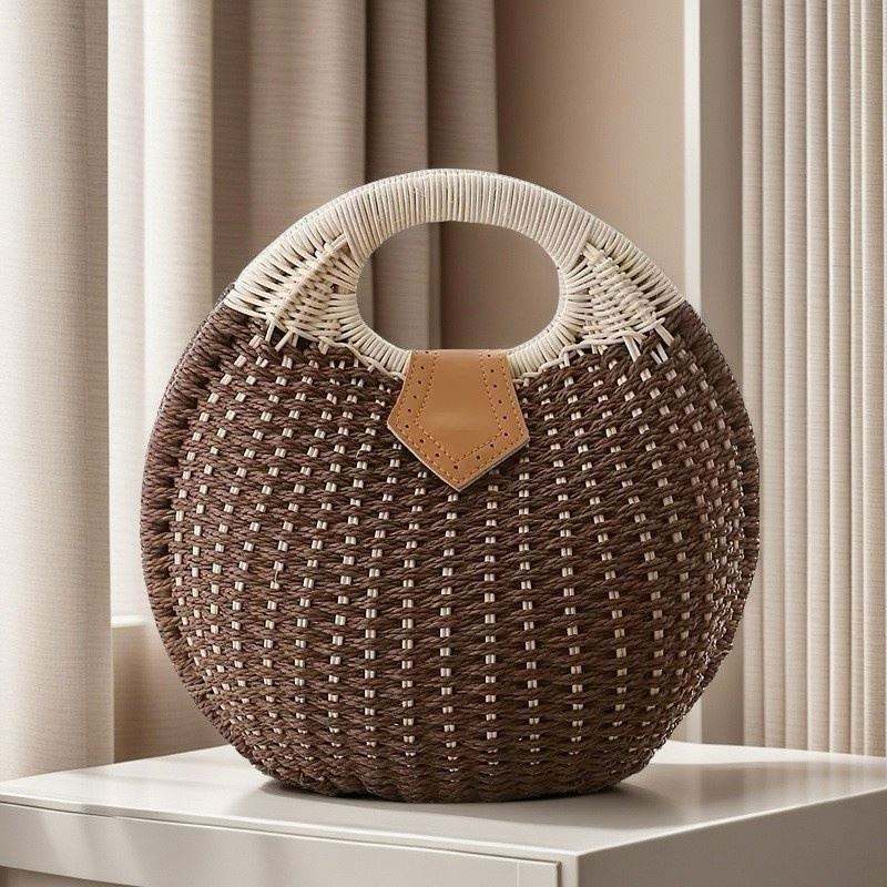 กระเป๋าถือสานทรงกลมสไตล์โบฮีเมียนสำหรับผู้หญิง ทำด้วยมือจากหวาย กระเป๋าทรงเปลือกหอยสำหรับฤดูร้อน กระเป๋าถือชายหาดจากฟางธรรมชาติ