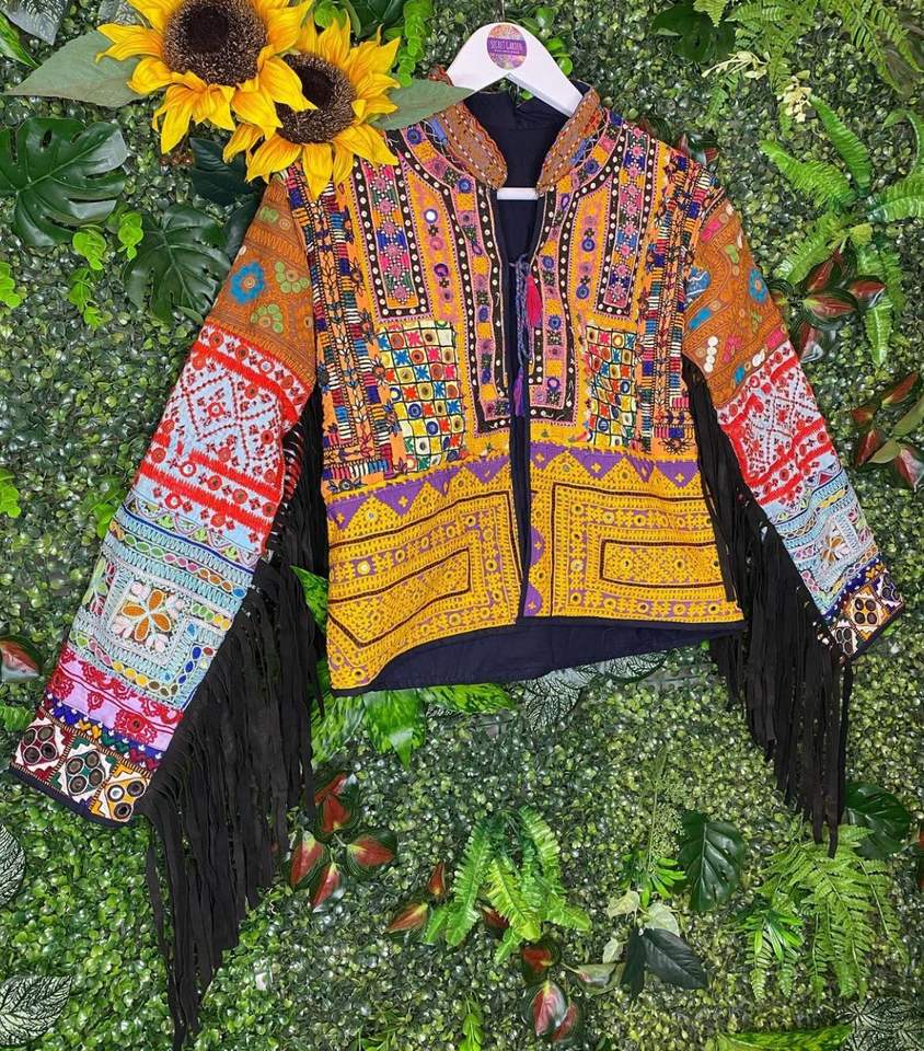 เสื้อแจ็คเก็ตสไตล์โบฮีเมียน แต่งพู่หนังกลับ ปะติดปะต่อแบบบันจารา