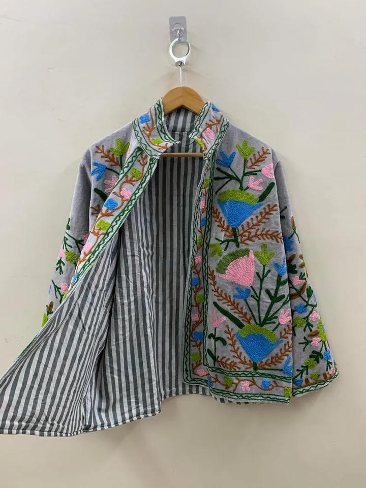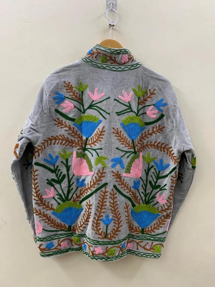 Suzani โบฮีเมียนปักลาย suzani เสื้อแจ็คเก็ตกำมะหยี่แบบโบฮีเมียนปักลายดอกไม้ suzani BOMBER แจ็คเก็ตผู้หญิง