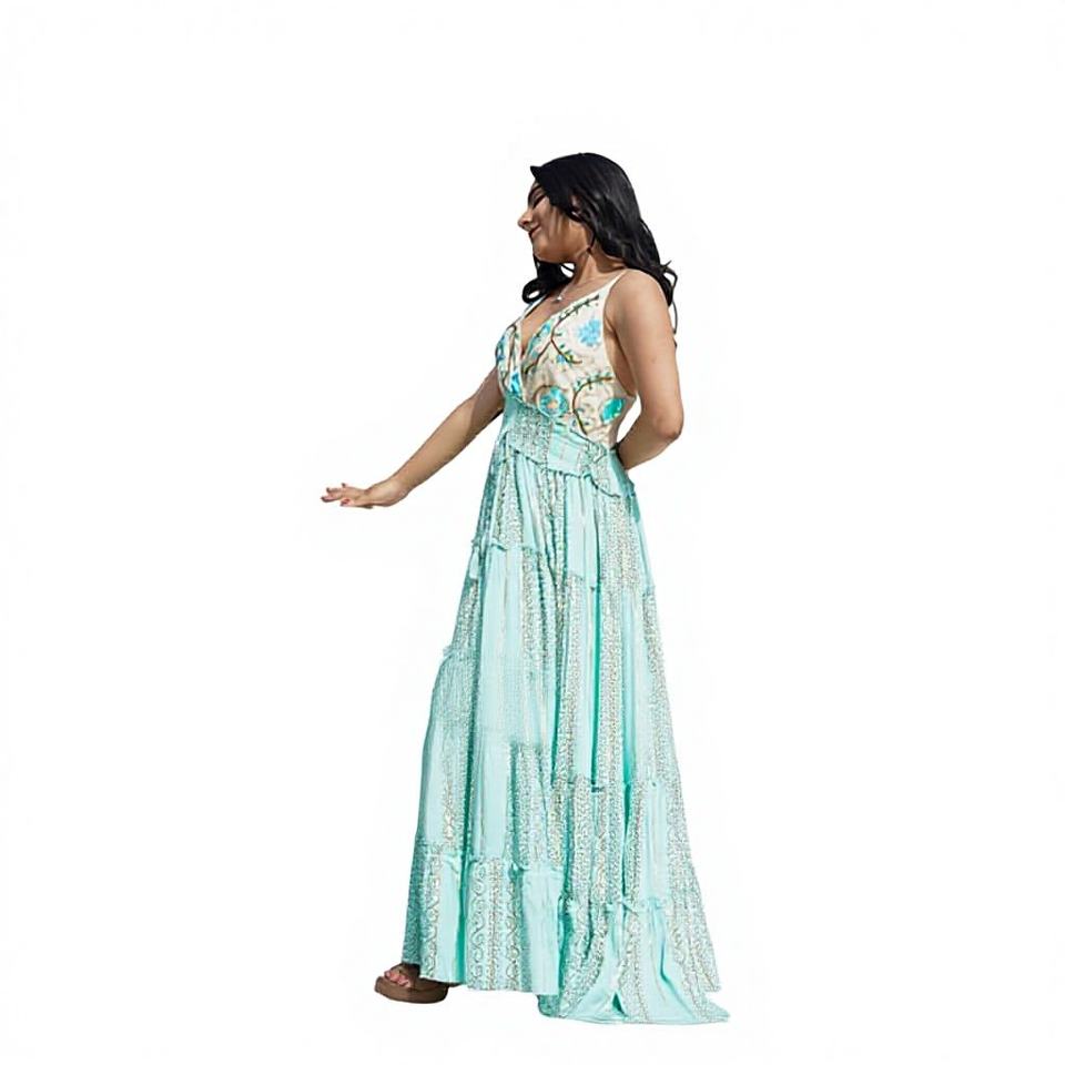 มินิเดรสสีเทอร์ควอยซ์สไตล์โบฮีเมียน ปักลายแขนบานทรงตรง ชุดเดรสฤดูร้อนสไตล์ชาติพันธุ์ ชุดใส่เที่ยวพักผ่อน น้ำหนักเบา