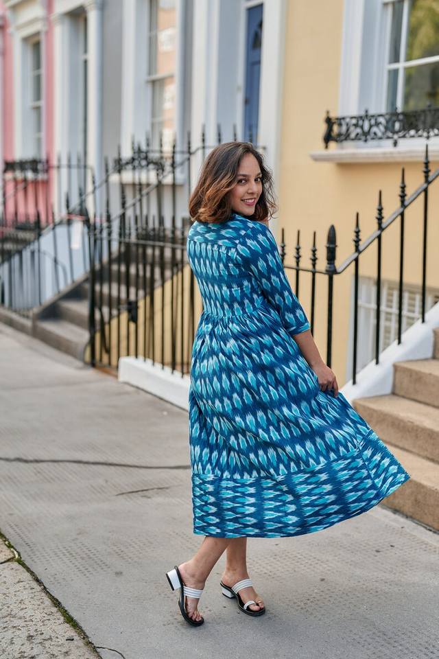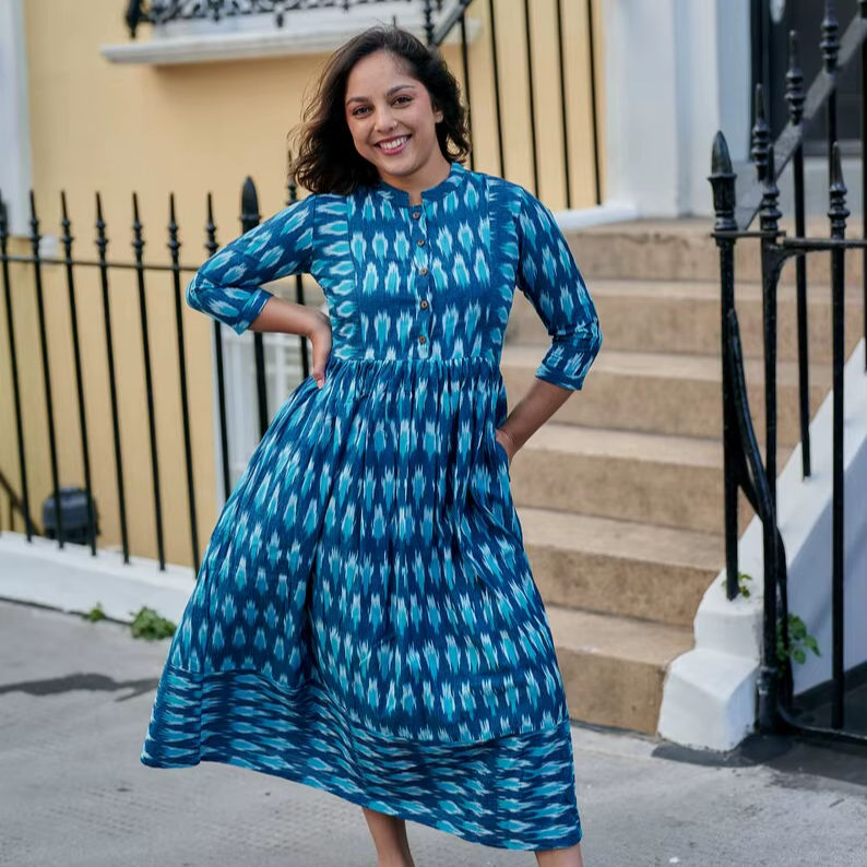 ชุดเดรสโบฮีเมียนวารุนี ผ้าทอมือลายอิคัต ผ้าฝ้ายแท้ สไตล์ลำลอง สำหรับใส่ในช่วงฤดูร้อนหรือวันหยุด ผลิตด้วยมือ แฟชั่นที่เป็นมิตรต่อสังคม
