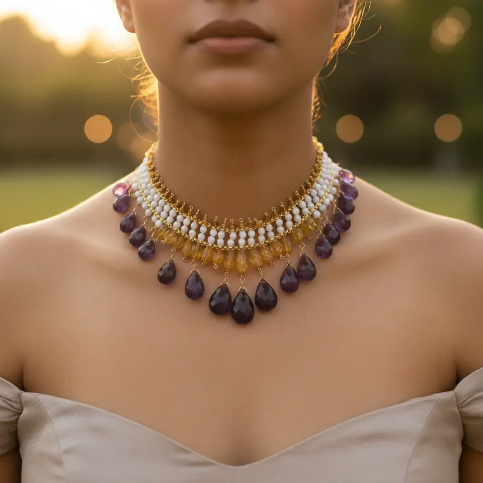 สร้อยคอประดับอัญมณีสไตล์โบฮีเมียนวินเทจ ลูกปัดสีม่วงและสีเหลือง ประดับด้วยโกเมน อาเกต เทอร์ควอยซ์ มุก และหยก ของขวัญสไตล์โบโฮ