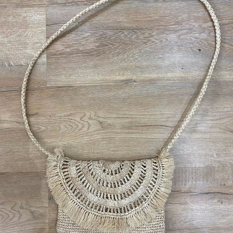 กระเป๋าสะพายข้างสไตล์โบฮีเมียนทำจากเส้นใยราฟเฟีย พร้อมกระดุมปิดและซับในหนังแท้