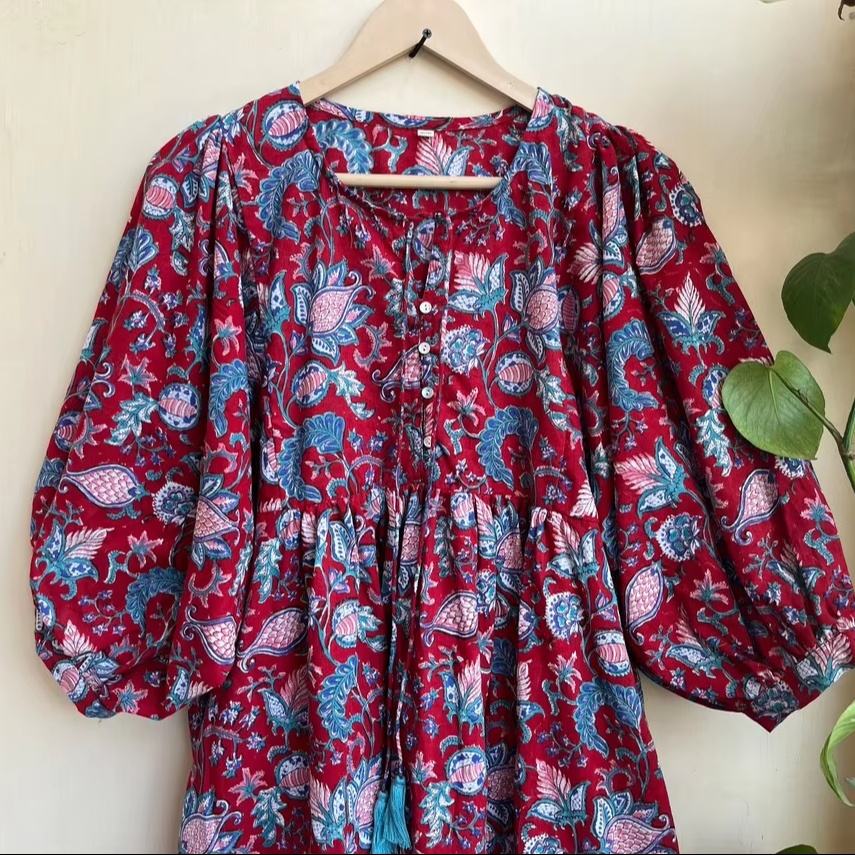 เดรสยาวโบฮีเมียนลายดอกไม้ ผ้าฝ้ายพิมพ์ลายด้วยมือ เดรสพิมพ์ลายดอกไม้ แขนยาว สวมใส่สบายๆ เดรสยาวสำหรับผู้หญิง