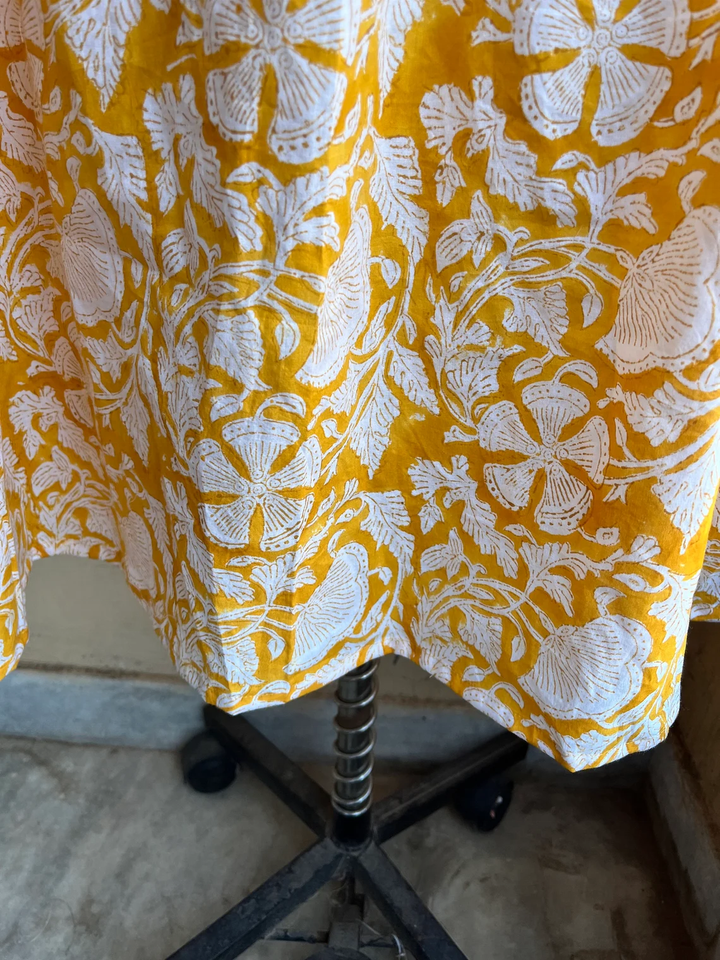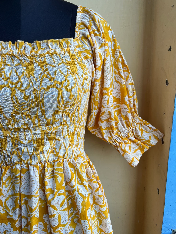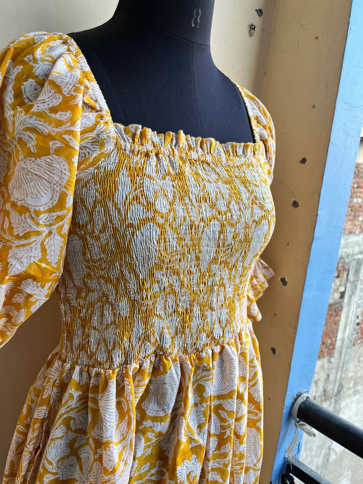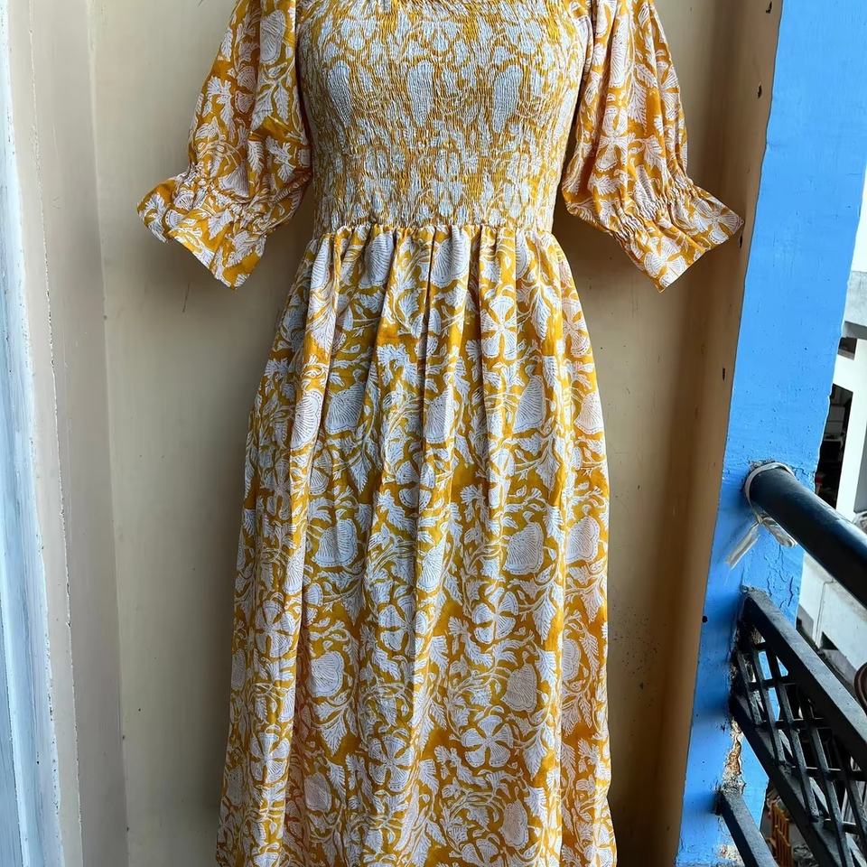 เดรสยาวโบฮีเมียนลายดอกไม้ผ้าฝ้ายสีเหลืองพิมพ์ลายด้วยมือ คอเหลี่ยม แขนยาว สำหรับผู้หญิง ขายดีประจำปี 2026