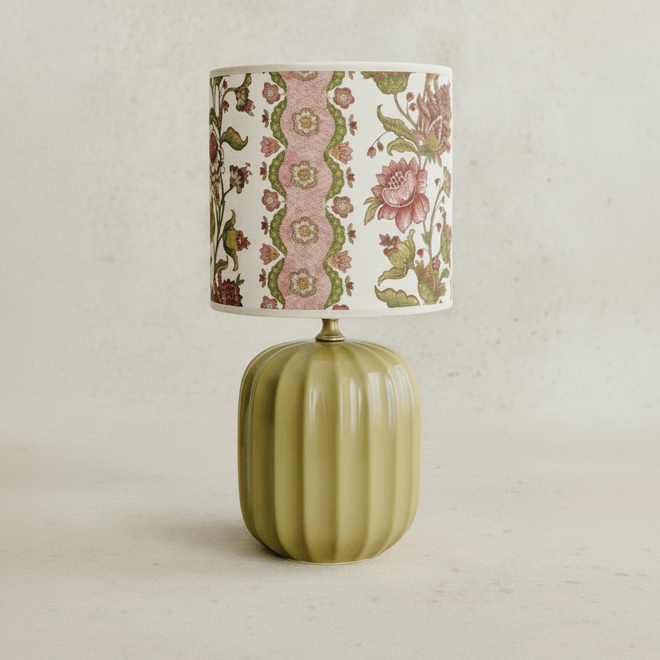 โคมไฟตั้งโต๊ะโบฮีเมียนที่มีฐานเซรามิกสีเขียวปราชญ์และทรงกระบอกตัดกันมีจำหน่ายในราคาขายส่ง
