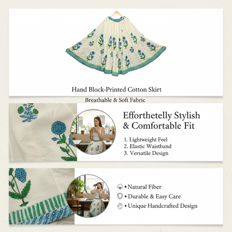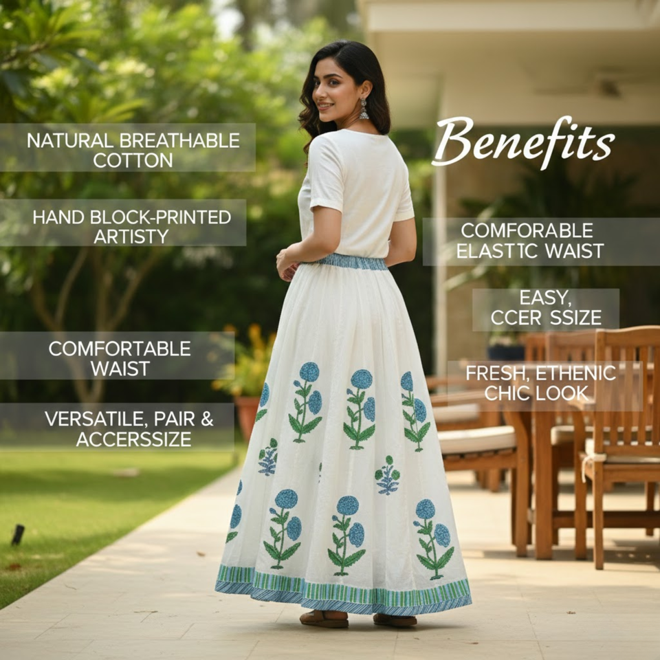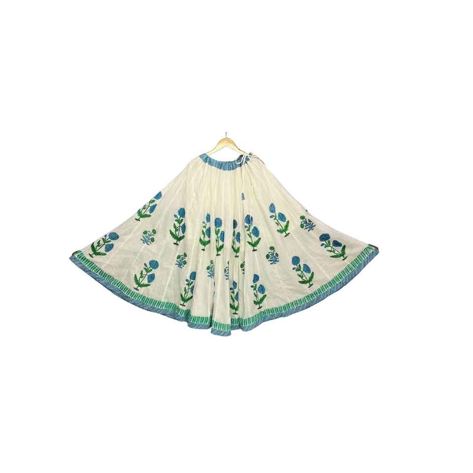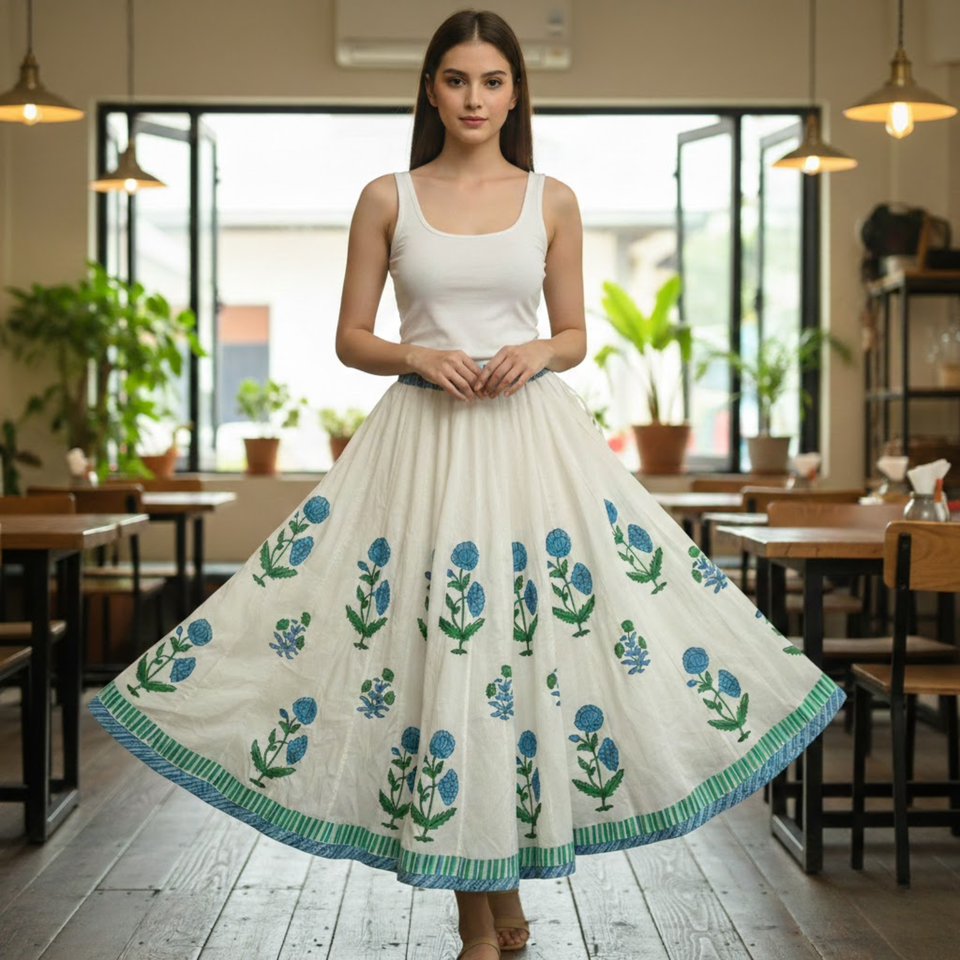 กระโปรงยาวลายดอกไม้สไตล์โบฮีเมียน 36 ลาย คอลเลคชั่น Kali ผ้าฝ้ายพิมพ์ลายด้วยมือ พร้อมซับใน Astar และขอบตัดเย็บแบบคอนทราสต์