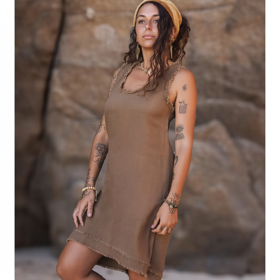 เดรสสีน้ำตาลสไตล์โบฮีเมียน ชิค ความยาวปานกลาง ผ้าฝ้าย 100% ระบายอากาศได้ดี เดรสสั้นสำหรับฤดูร้อน แต่งชายครุย สไตล์โบฮีเมียน สำหรับผู้หญิง