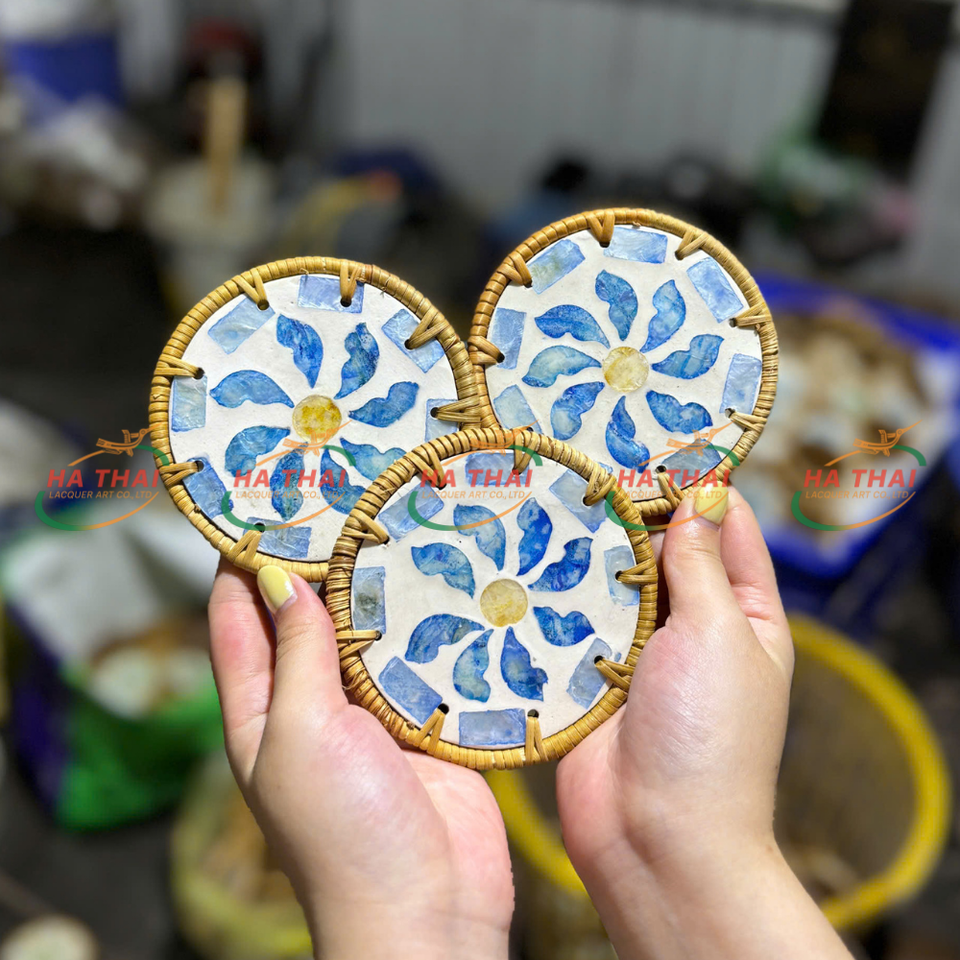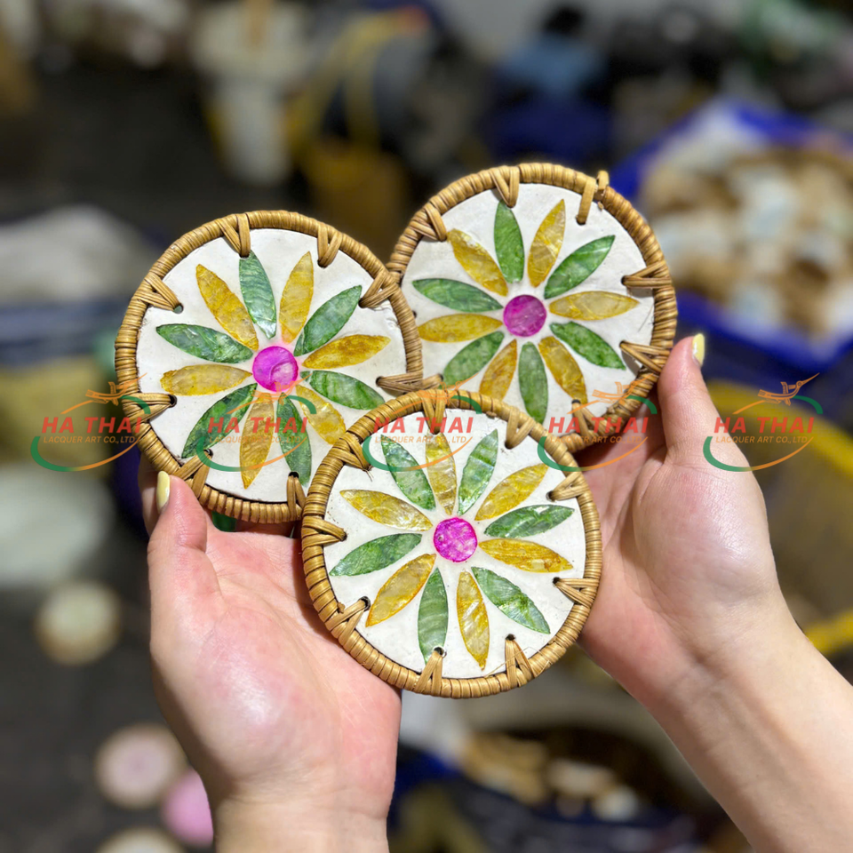 แผ่นรองแก้วสไตล์โบโฮชิค ทำจากหวายสาน ประดับด้วยเปลือกหอยคาปิซ ดีไซน์โมเสค รูปทรงกลม ของตกแต่งบ้านสุดพิเศษ ของขวัญสำหรับองค์กร