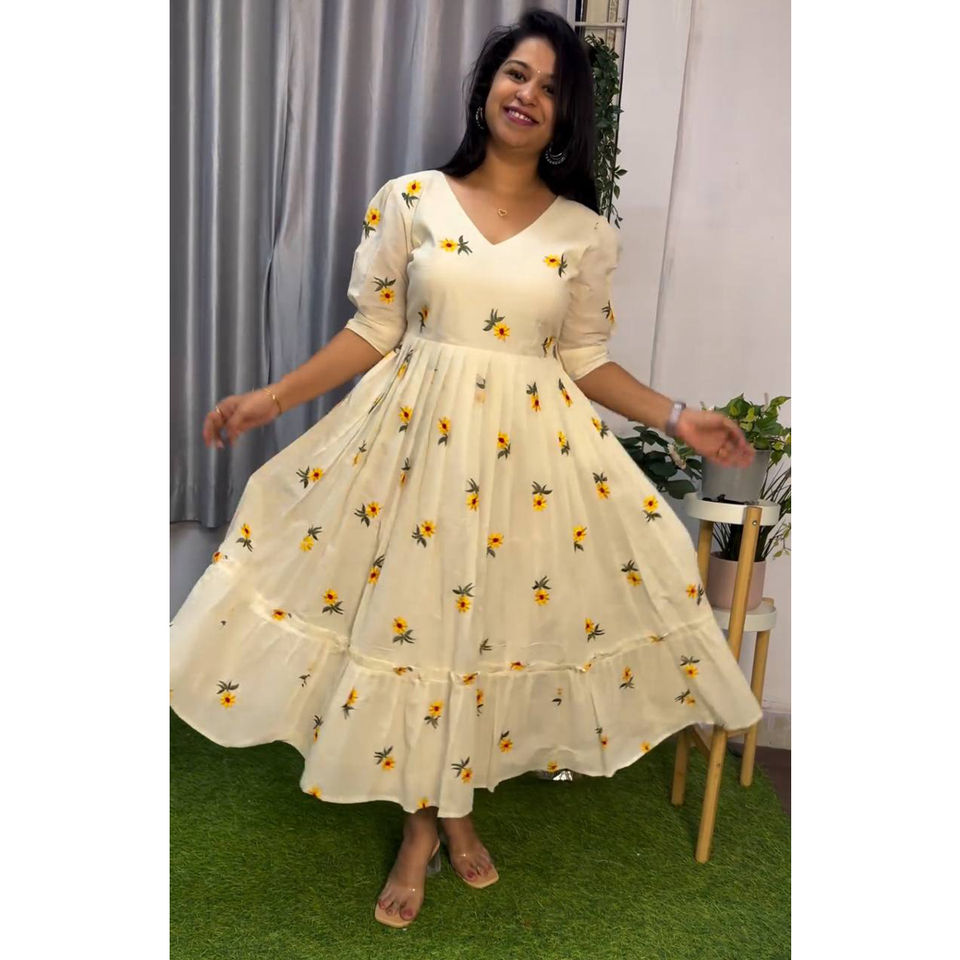 Boho ชุดเดรสยาวของผู้หญิงแบบเก๋ไก๋ชุดเดรสยาวพิมพ์ลายดอกไม้ชุดแม็กซี่แต่งชั้นสไตล์พื้นเมืองแขนพองทรงเอไลน์สำหรับฤดูร้อนและสวมใส่ในชีวิตประจำวัน