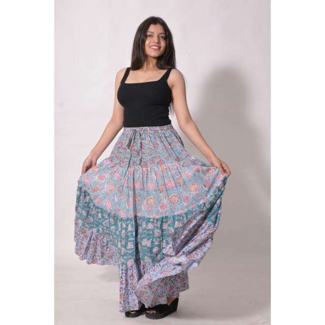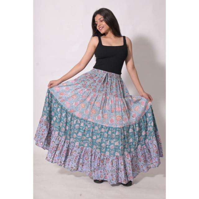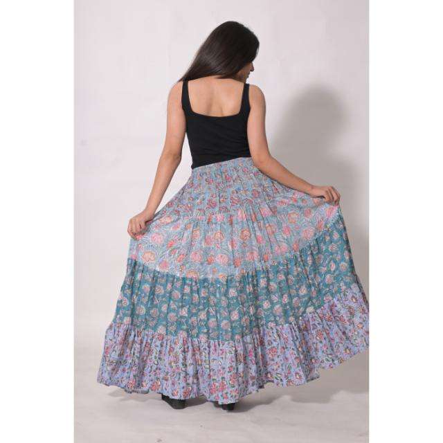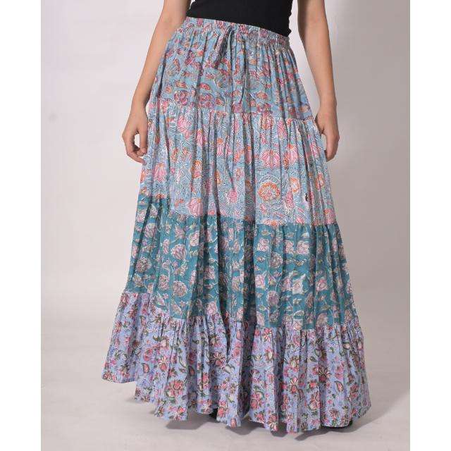 กระโปรงยาวลายบล็อกพิมพ์ผ้าฝ้ายสไตล์โบฮีเมียน ตกแต่งลายดอกไม้แบบแพทช์เวิร์ค กระโปรงแม็กซี่ทำมือจากอินเดีย เหมาะสำหรับฤดูร้อน เป็นมิตรกับสิ่งแวดล้อม ระบายอากาศได้ดี สวมใส่สบาย