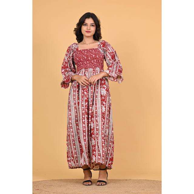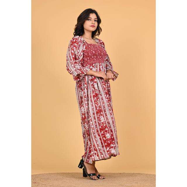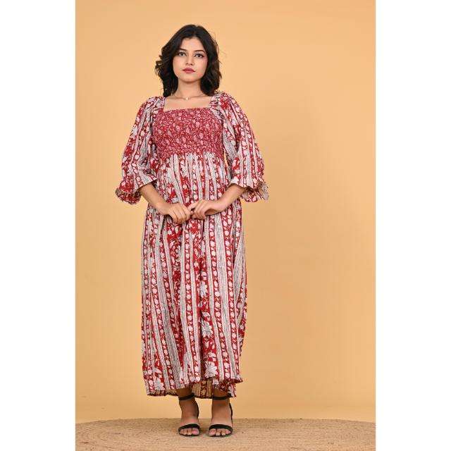 Boho 100% Cotton Block Print Eco-Friendly Long Maxi Dress Women Smocked Indian Summer Party Wear