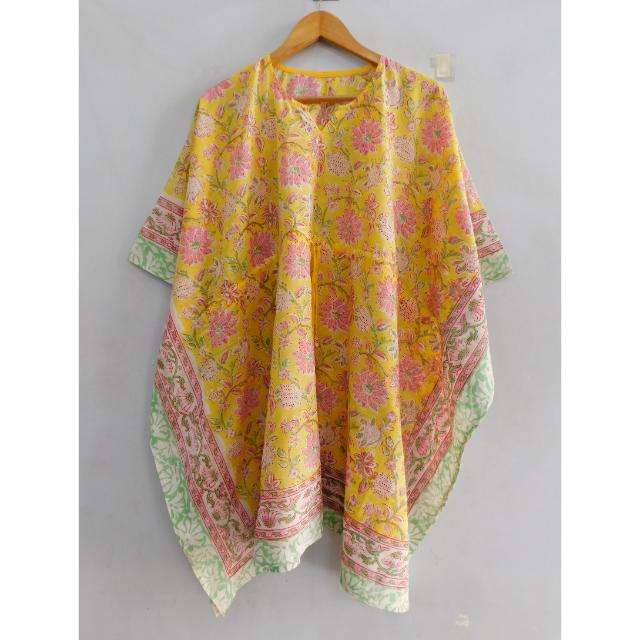 เดรสผ้าฝ้ายโบโฮ คอวี แขนทรงปีกค้างคาว เป็นมิตรกับสิ่งแวดล้อม งานแฮนด์เมด พิมพ์ลายบล็อก ชุดคลุมชายหาดทรงหลวม เสื้อคลุมทูนิคสำหรับฤดูร้อน สไตล์รีสอร์ท ผ้าธรรมชาติ
