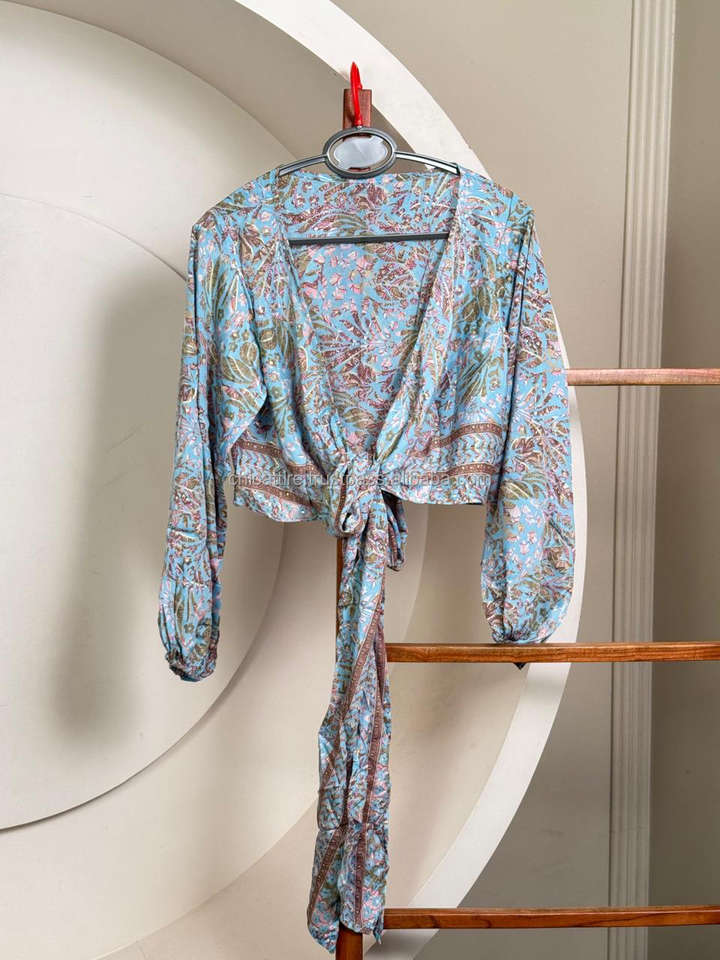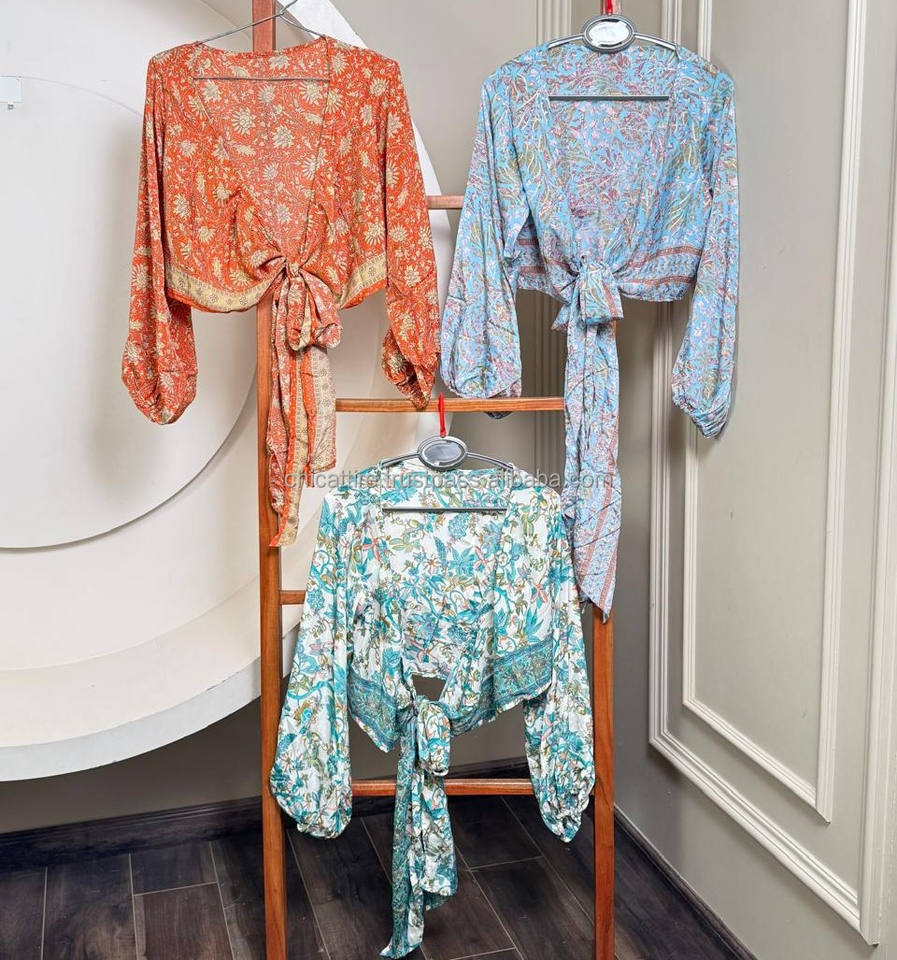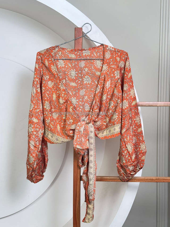 เสื้อครอปผูกด้านหน้าลายดอกไม้สไตล์โบฮีเมียนสำหรับผู้หญิง คอวีลึก แขนยาว เหมาะสำหรับใส่เที่ยวพักผ่อน ใส่ลำลอง ใส่ไปงานปาร์ตี้ แฟชั่นเสื้อผู้หญิงจากผู้ผลิต