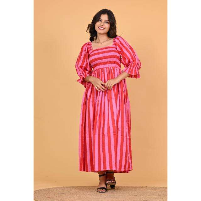 เดรสยาวลายดอกไม้สไตล์โบฮีเมียน ผ้าฝ้าย แต่งสม็อคเอวยางยืด แขนบาน สำหรับผู้หญิง ฤดูร้อน งานแฮนด์เมดอินเดีย สไตล์ลำลอง เป็นมิตรกับสิ่งแวดล้อม