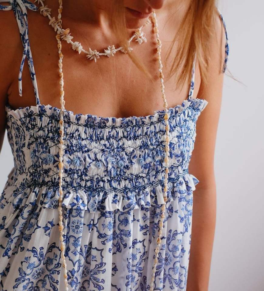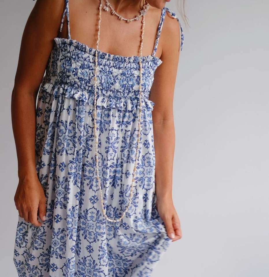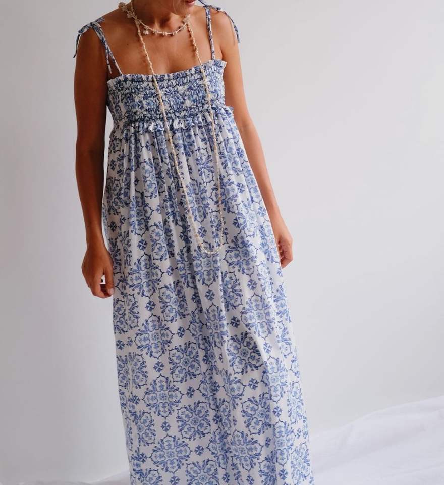 เดรสยาวสไตล์โบฮีเมียนลายดอกไม้สำหรับผู้หญิง พร้อมลายพิมพ์บล็อกสีน้ำเงินแบบทำมือ แขนกุด เหมาะสำหรับใส่ไปเที่ยวทะเลในฤดูร้อน สายคล้องไหล่ปรับได้