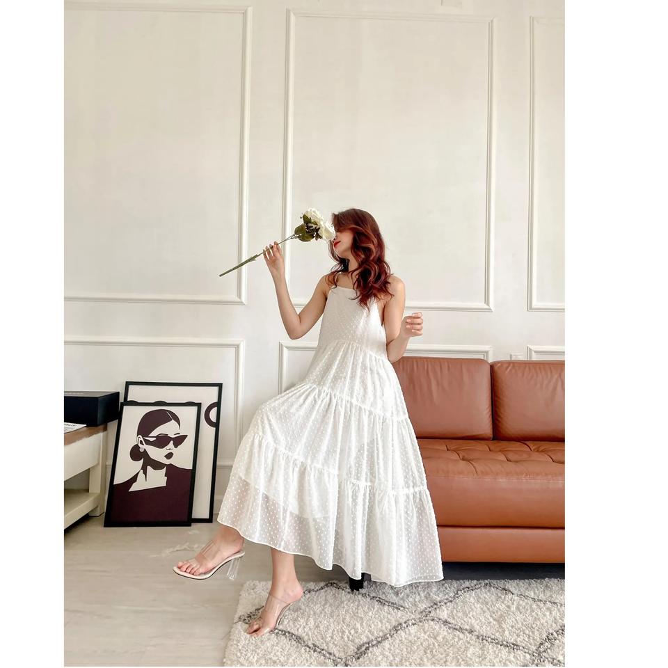 เดรสชีฟองสีขาวทรงมินิ ชายโค้งแบบโบโฮ เอวธรรมชาติ สายเดี่ยว สไตล์ลำลอง เหมาะสำหรับใส่ไปเที่ยวทะเล ฤดูร้อน 2024 ผลิตในเวียดนาม