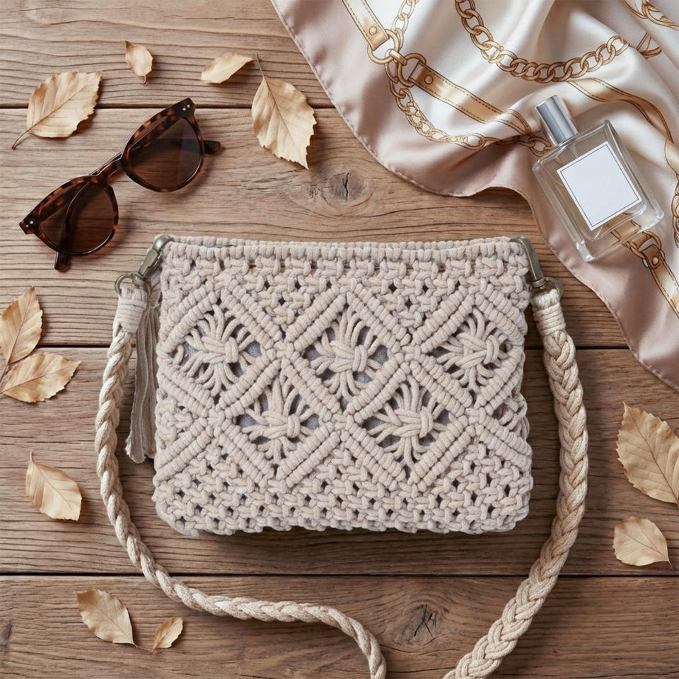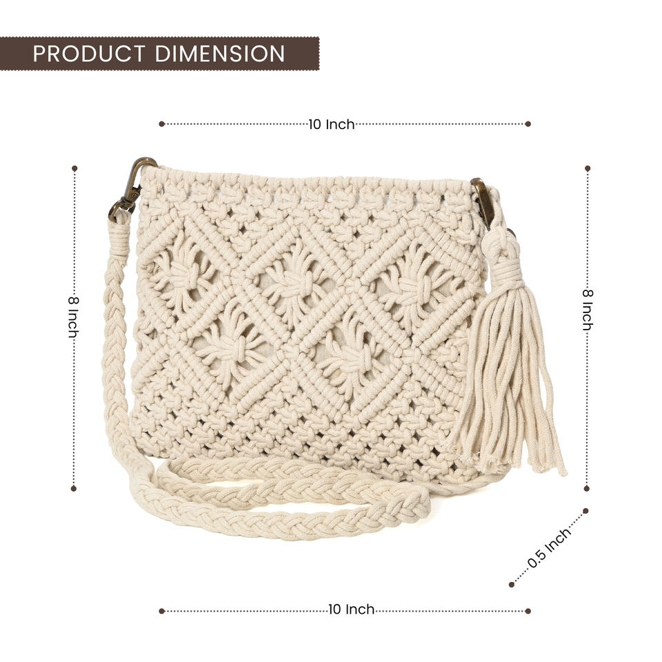 กระเป๋าสะพายข้างทำมือสไตล์โบฮีเมียนจากผ้าฝ้ายถักมาคราเม่ พร้อมพู่ห้อย กระเป๋าคลัทช์สะพายไหล่สไตล์วินเทจสำหรับผู้หญิง