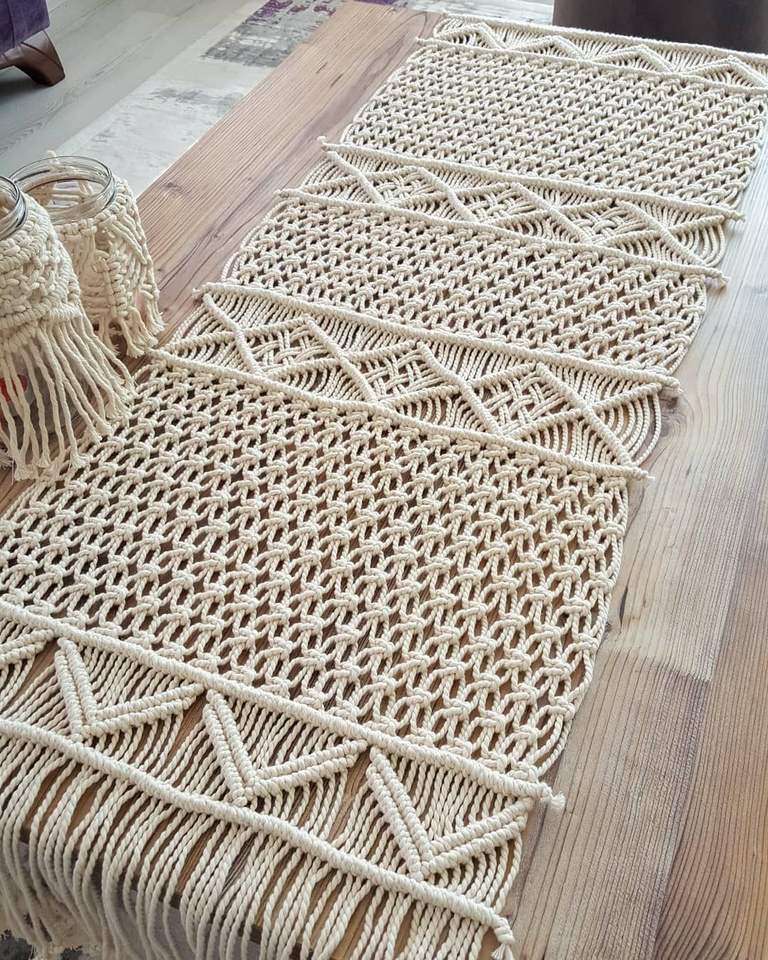 ผ้าปูโต๊ะมาคราเม่สไตล์โบโฮ ทำมือจากเชือกฝ้ายธรรมชาติ ตกแต่งด้วยลูกไม้ทอมือ เหมาะสำหรับตกแต่งโต๊ะอาหารในงานแต่งงานและงานปาร์ตี้