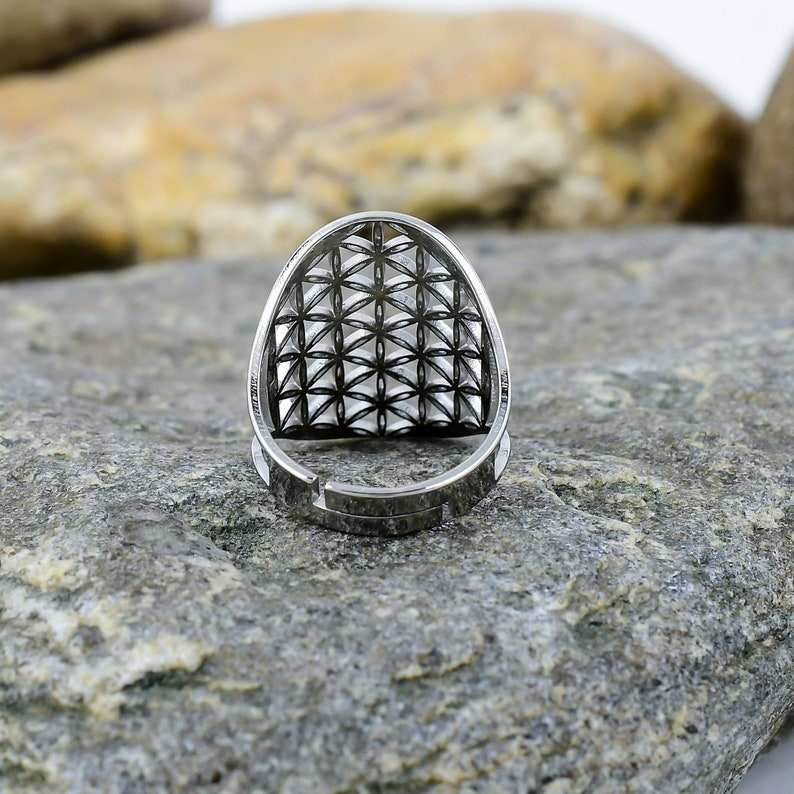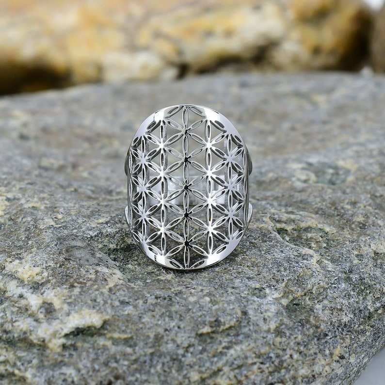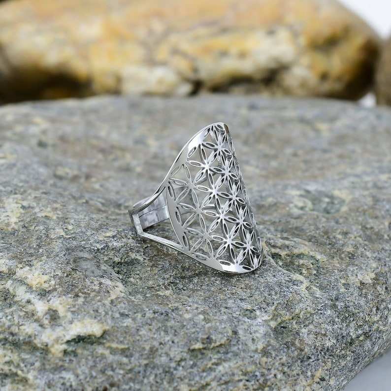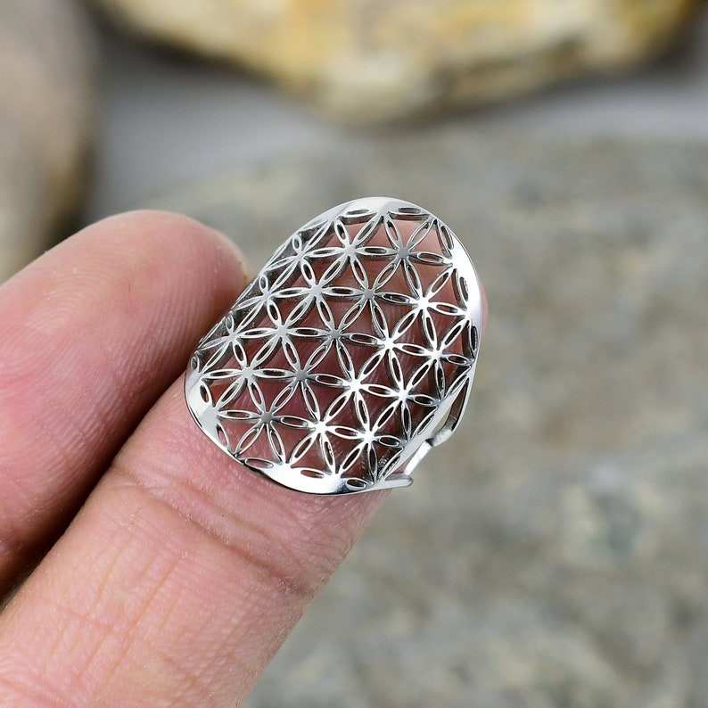 โบฮีเมียนฮิปปี้หนาเงินสแตนเลสปรับได้รูปทรงเรขาคณิตแหวนดอกไม้แฮนด์เมดดีไซน์ไม่ซ้ำใคร