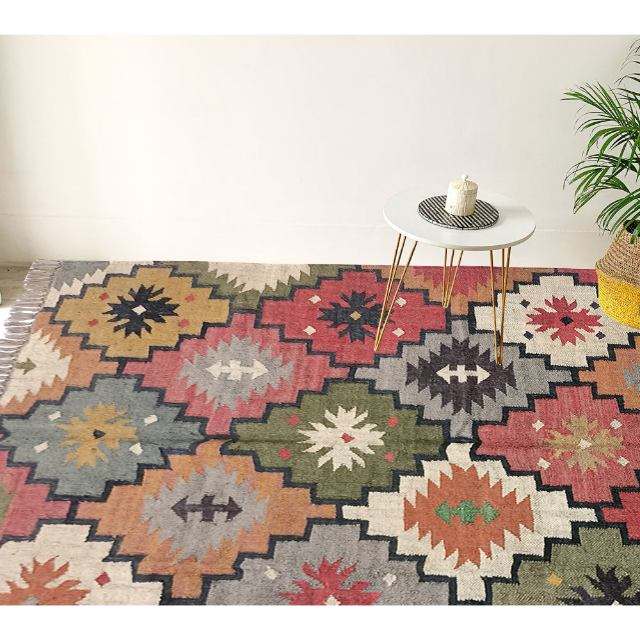 Boho-Inspired 5x7 Wool and Jute Kilim Rug, Warm Dhurrie Mat and Area Carpet for Hall or Bedroom Flooring