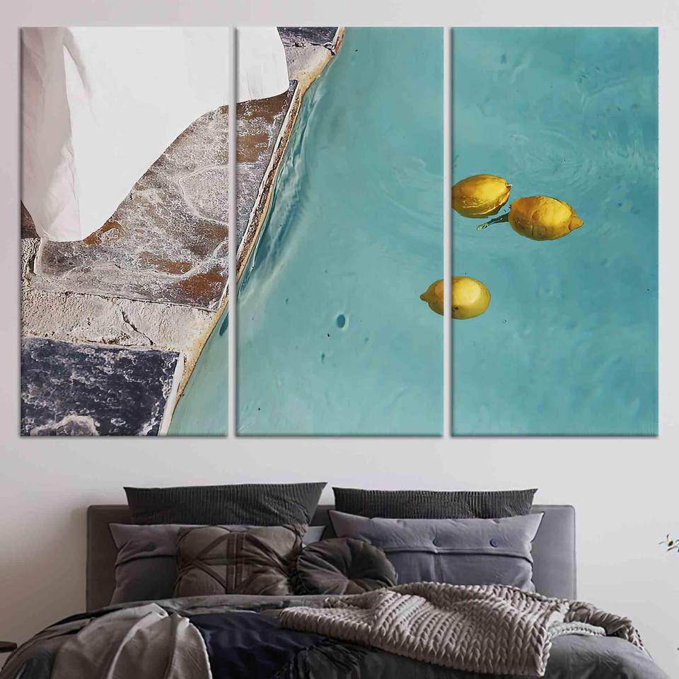 ภาพพิมพ์บนผ้าใบสำหรับห้องนั่งเล่นสไตล์โบโฮ: ฉากสระว่ายน้ำลายมะนาวสุดศิลปะ ชุดผ้าใบ 3 ชิ้น