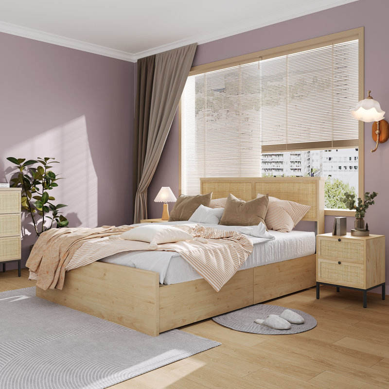 ชุดโต๊ะข้างเตียง2ลิ้นชักสไตล์ Boho ทำจากหวายธรรมชาติ2ข้าง