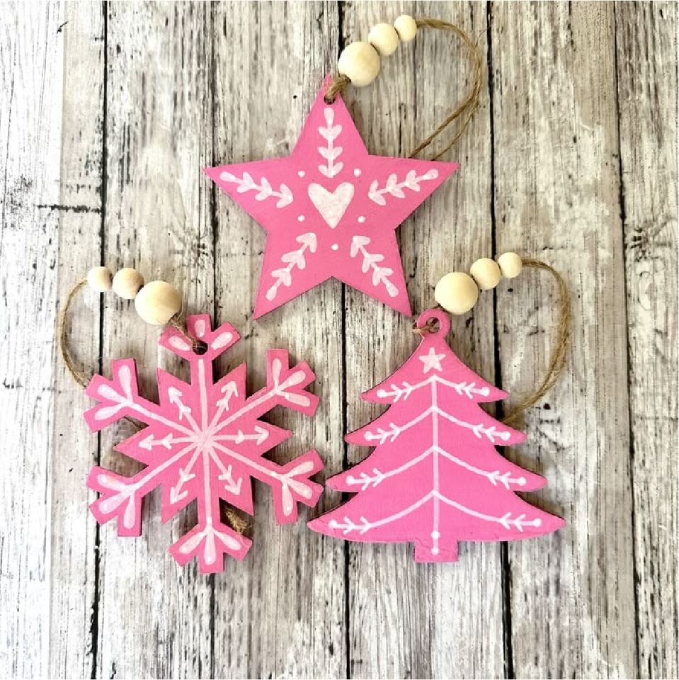 เครื่องประดับคริสต์มาสทรงโบโฮสีชมพู ทำจากลูกปัดไม้ ตัดด้วยเลเซอร์ รูปดาวและเกล็ดหิมะ ทำสีเองได้ ของตกแต่งงานปาร์ตี้และเครื่องประดับต้นคริสต์มาส