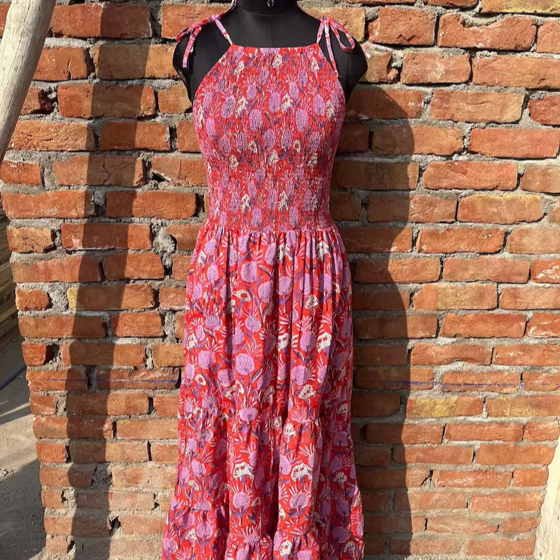 Boho ชุดฤดูร้อนเดรสผ้าฝ้ายอินเดียชุดเดรสยาวสีชมพูพร้อมมือพิมพ์ลายดอกไม้ดีไซน์แปลก