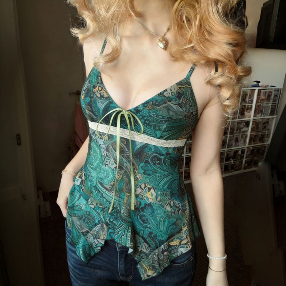เสื้อสายเดี่ยวทรงเอไลน์พิมพ์ลายโบโฮวินเทจสำหรับผู้หญิง แต่งผ้าลูกไม้ผูกคอวีทรงเข้ารูปสำหรับฤดูร้อน
