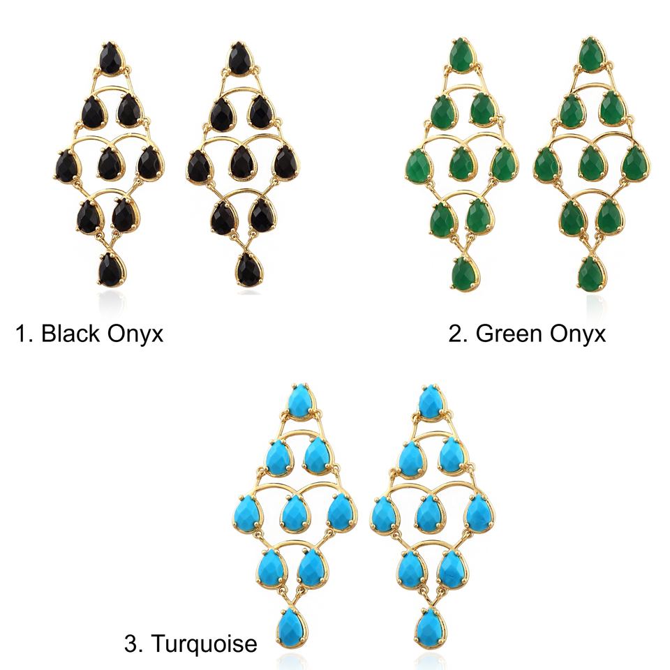 ต่างหูระย้าสไตล์โบฮีเมียนประดับพลอยเทอร์ควอยซ์สีน้ำเงินหลายเม็ด ตัวเรือนทองเหลืองชุบทอง 18k เครื่องประดับแฟชั่น ต่างหูโดดเด่น