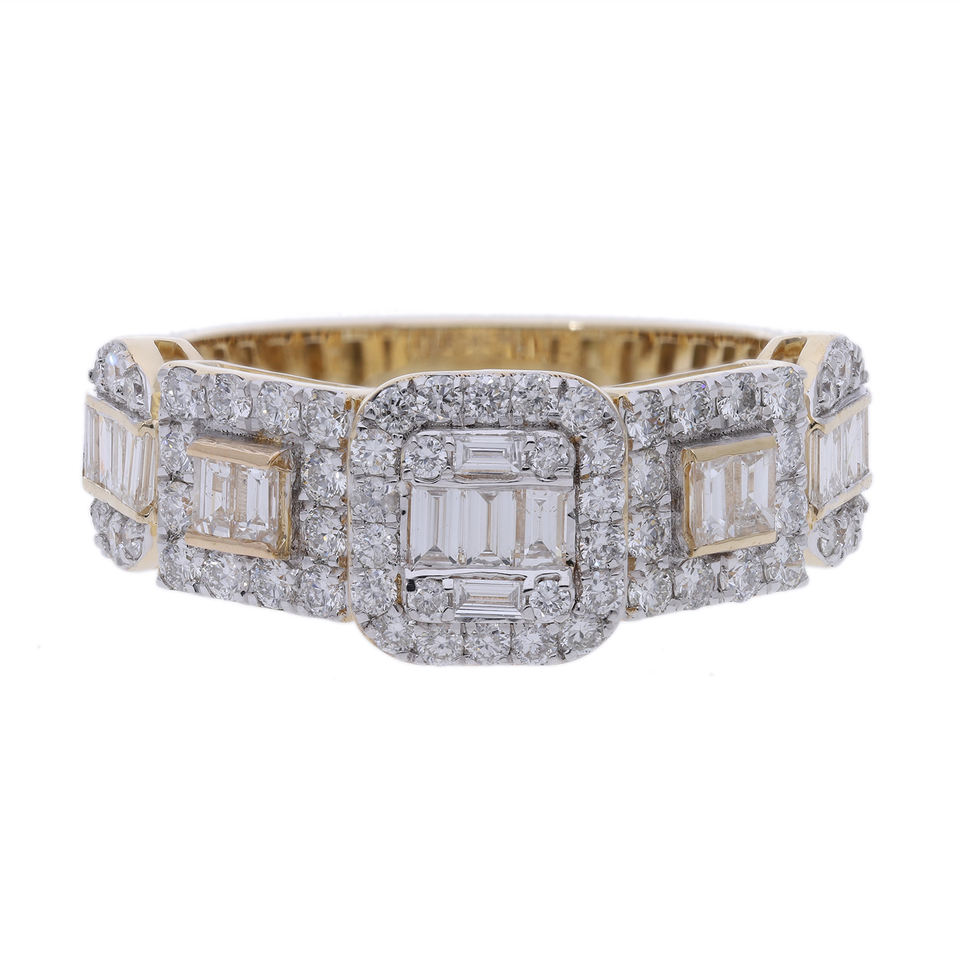 แหวนเพชรทรงเม็ดกลมทรงเรขาคณิตสีทอง14K แบบหนาพร้อมบาแกตต์ธรรมชาติและเพชรเจียระไนทรงกลม