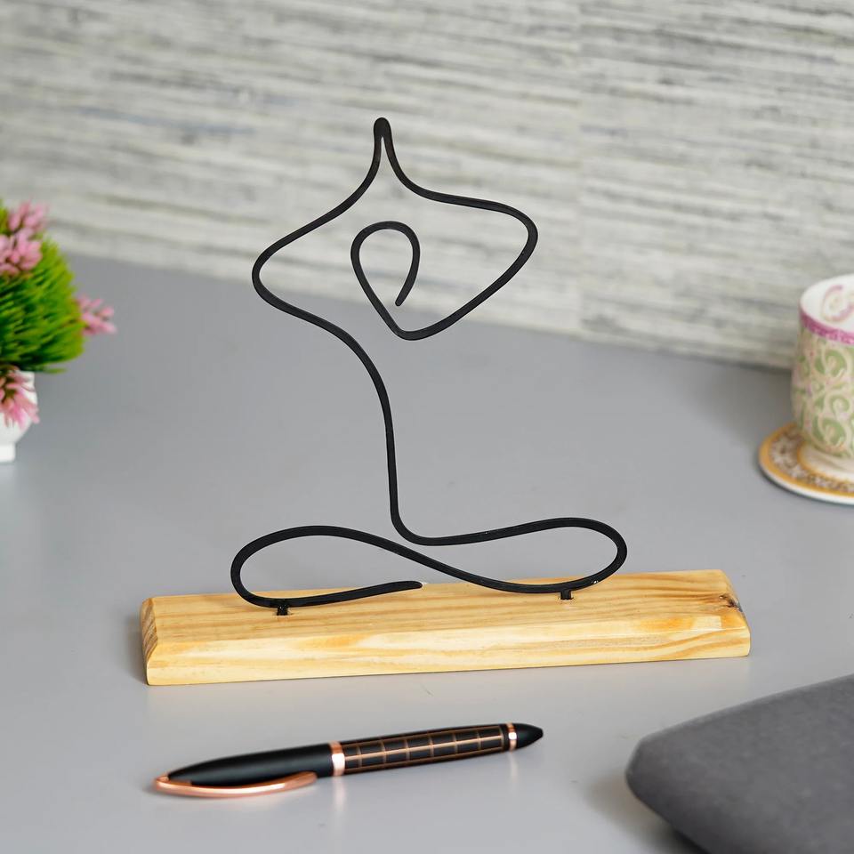 Bold Black Metal Female Yoga Pose Sculpture With Wooden Base Stylish Table Object Perfect For Contemporary Homes From India