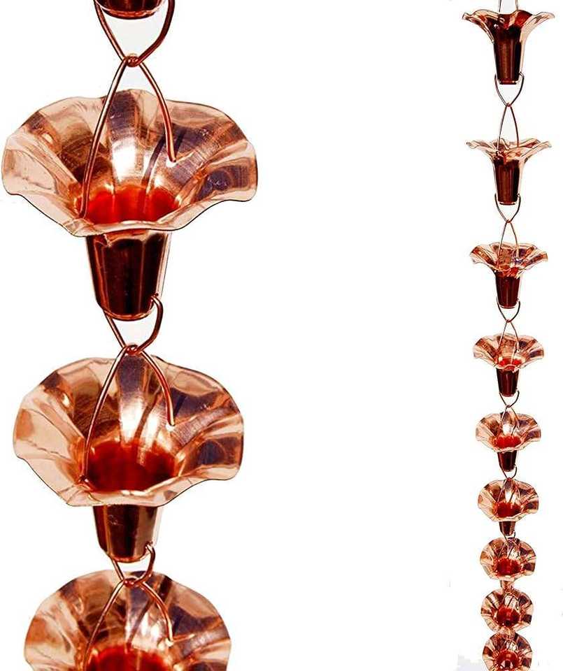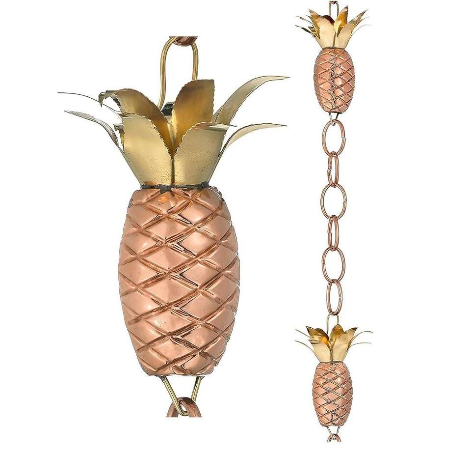 โซ่ระบายน้ำรูปทรงสับปะรด รุ่น Bold Blossom ทำจากทองแดงแท้ 100% ความยาว 8-1/2 ฟุต ออกแบบอย่างมีศิลปะสำหรับตกแต่งสวน ใช้แทนรางน้ำฝน
