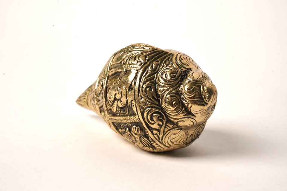 เชิงประดับทองเหลืองโบราณแบบดั้งเดิม รุ่นโกลด์ บลอสซัม (เปลือกหอยสังข์) | หิ้งบูชาฮินดูงานแกะสลักทำมือสำหรับงานแต่งงานและเทศกาลดีวาลี