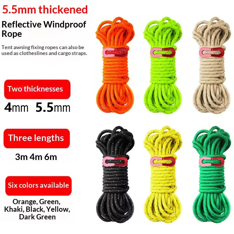 เชือกไนลอนหนาสำหรับเต็นท์แคมป์ปิ้ง กันลม 2 ชั้น ขนาด 4 มม./5.5 มม. ความยาว 3 ม. 4 ม. 6 ม. เชือกสะท้อนแสงพร้อมหัวเข็มขัดปรับได้สำหรับกันสาดกลางแจ้ง