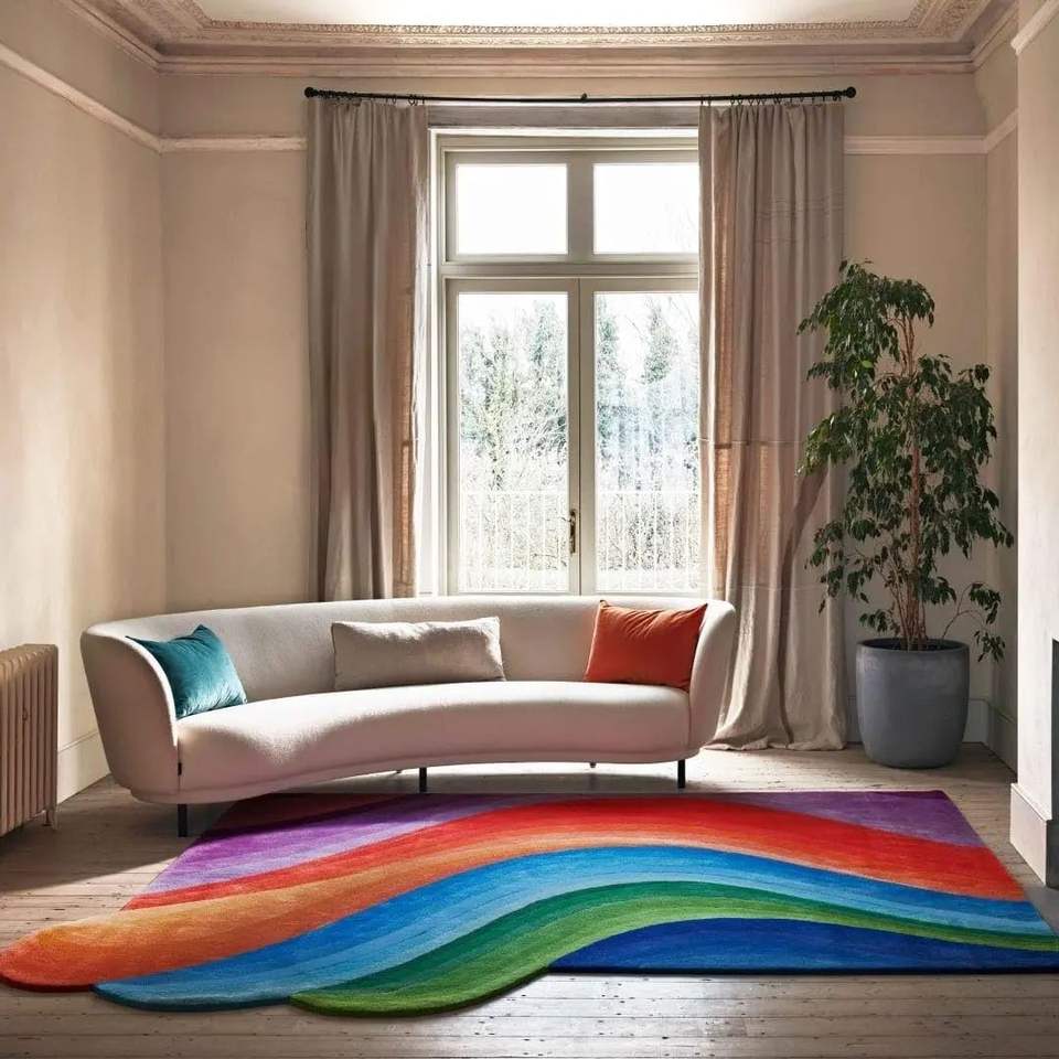 พรมขนสัตว์ลายคลื่นทำมือขนาด3.50x6ฟุต, ดีไซน์ทันสมัยตัวหนาสีสันสดใสกันลื่นสำหรับห้องนั่งเล่น
