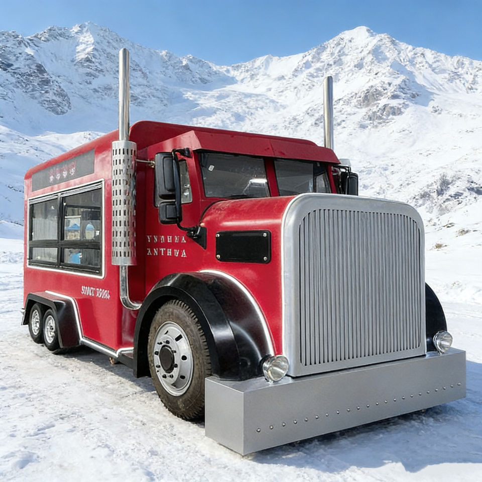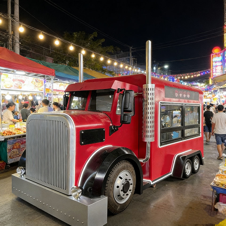 รถขายอาหารเคลื่อนที่สไตล์รถบรรทุกสีแดงสด ท่อไอเสียโครเมียม เครื่องปรับอากาศ รับประกัน 2 ปี สำหรับตลาดกลางคืน