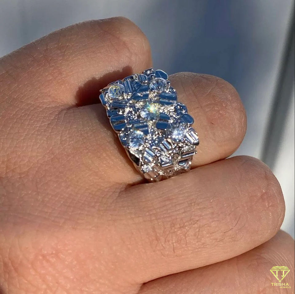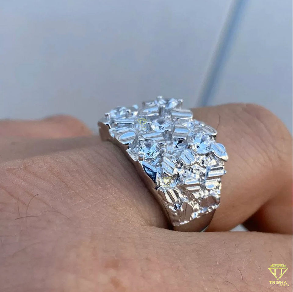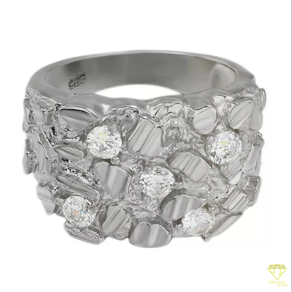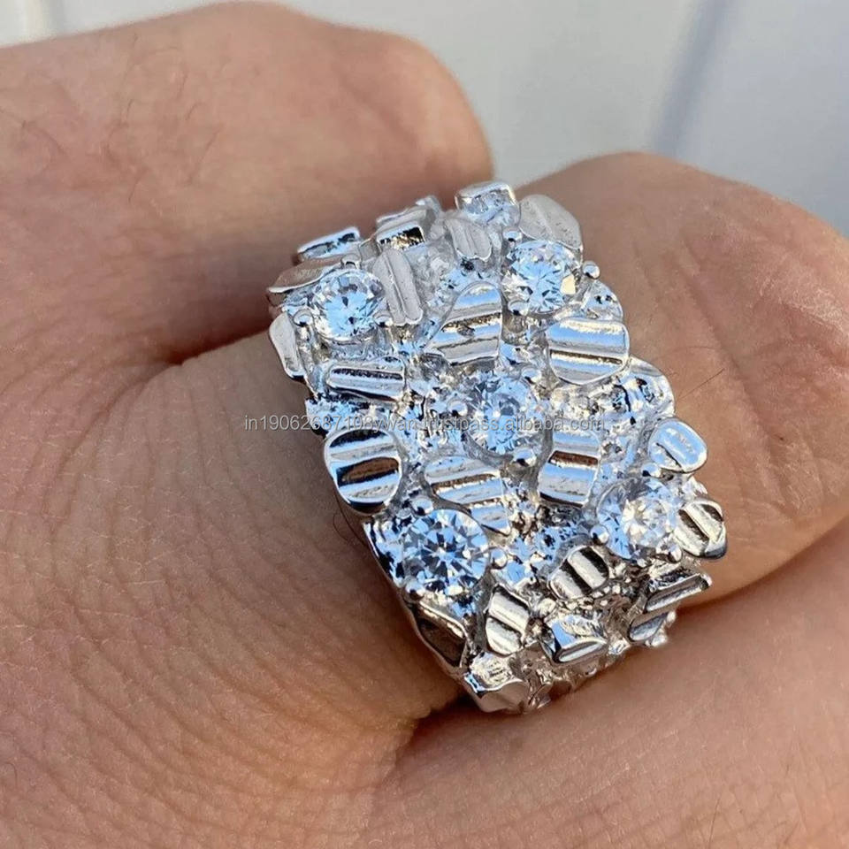 แหวนเงินหนาของผู้ชายที่มีหินใสหลายชิ้นและการออกแบบโลหะพื้นผิวเครื่องประดับหรูหราสง่างามสำหรับแฟชั่นและความสง่างาม