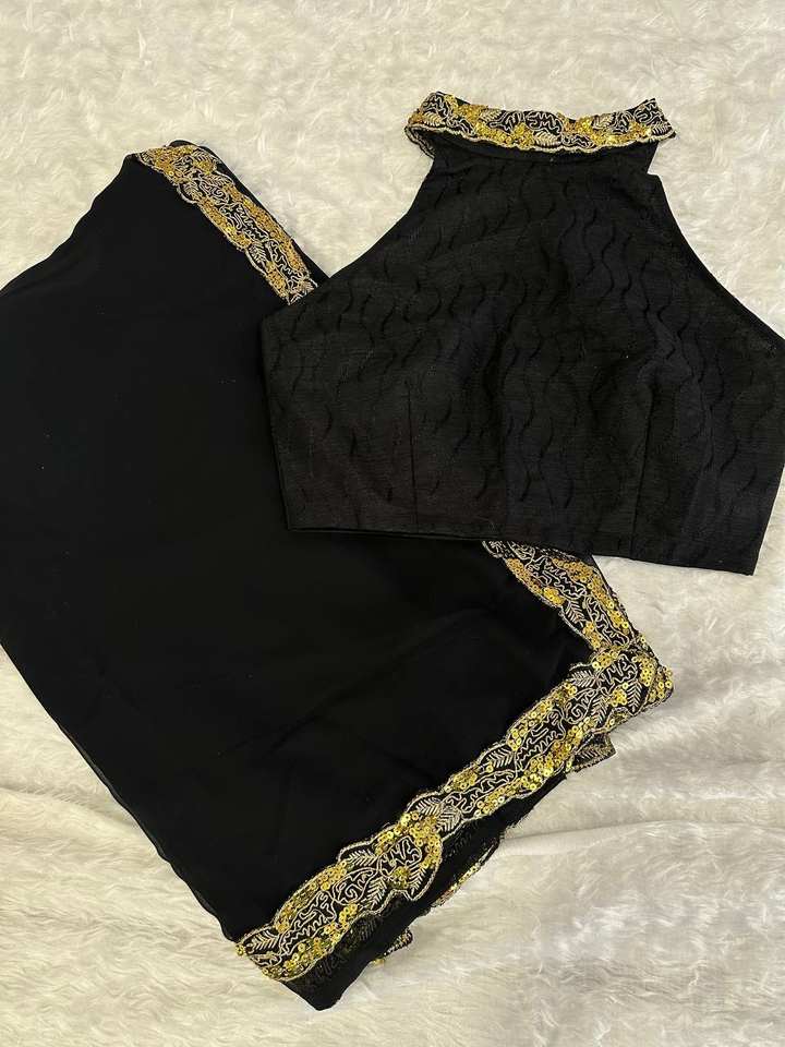 ชุดส่าหรีผ้าจอร์เจตต์สีดำปักเลื่อมสไตล์บอลลีวูดสำหรับงานปาร์ตี้ ดีไซน์เนอร์ออกแบบ พร้อมเสื้อส่าหรีแบบใหม่ล่าสุดสำหรับผู้หญิง