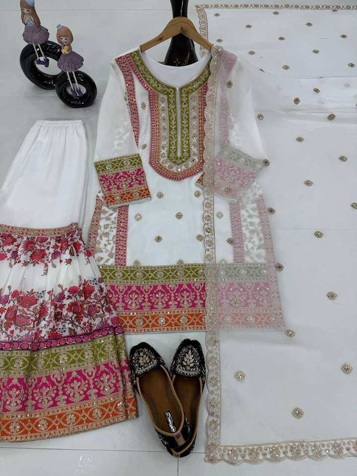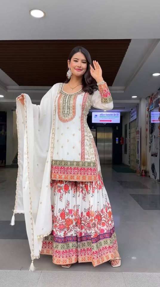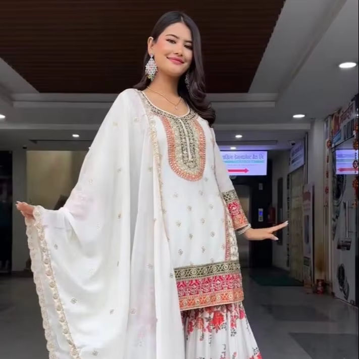 เสื้อคู่ Sharara สีขาวสไตล์บอลลีวูดปักลายดิจิตอลด้วยผ้าเทียมสำหรับใส่ไปงานปาร์ตี้ของผู้หญิงปากีสถานอินเดีย
