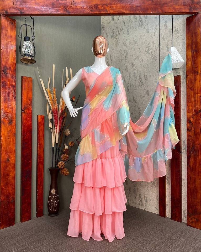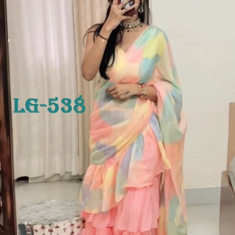Bollywood Ruffle Style Party Wear Georgette Crush With Printed Designer Saree for Women Latest Sarees Blouse Design India