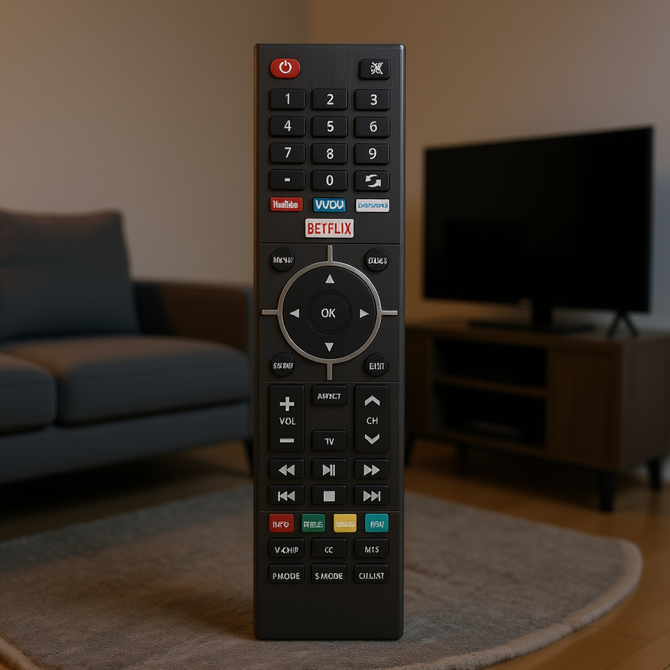 รีโมทคอนโทรลทีวีอิเล็กทรอนิกส์ยูนิเวอร์แซลอินฟราเรดระยะ 10 ม. ตัวเครื่องพลาสติก ใช้แบตเตอรี่ AAA เหมาะสำหรับความบันเทิงภายในบ้าน