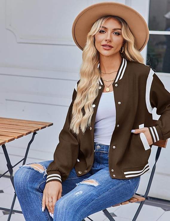เสื้อแจ็คเก็ตบอมเบอร์ผู้หญิง สไตล์วาร์ซิตี้ลำลอง ติดกระดุม ทรงมาตรฐาน สำหรับฤดูหนาว มีกระเป๋า ระบายอากาศได้ดี เป็นมิตรกับสิ่งแวดล้อม