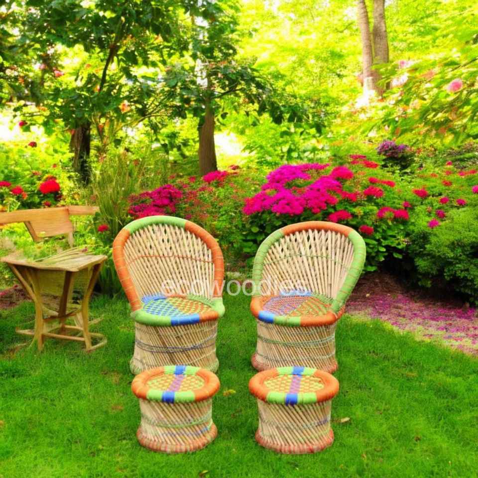 ชุดคอนโซลฝังกระดูกชุด sarkanda ของเก้าอี้เชือกไม้ไผ่พร้อมเก้าอี้นั่งแบบออตโตมันหมุนทำด้วยมือทั้งในร่มและกลางแจ้งสวนลานบ้าน