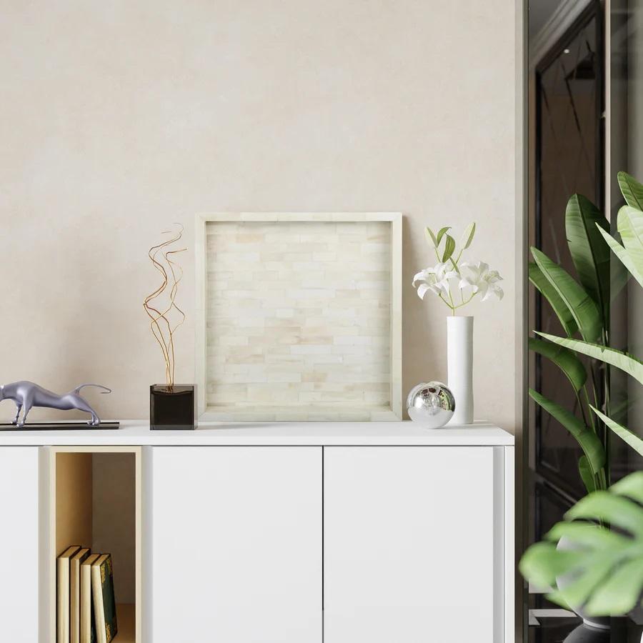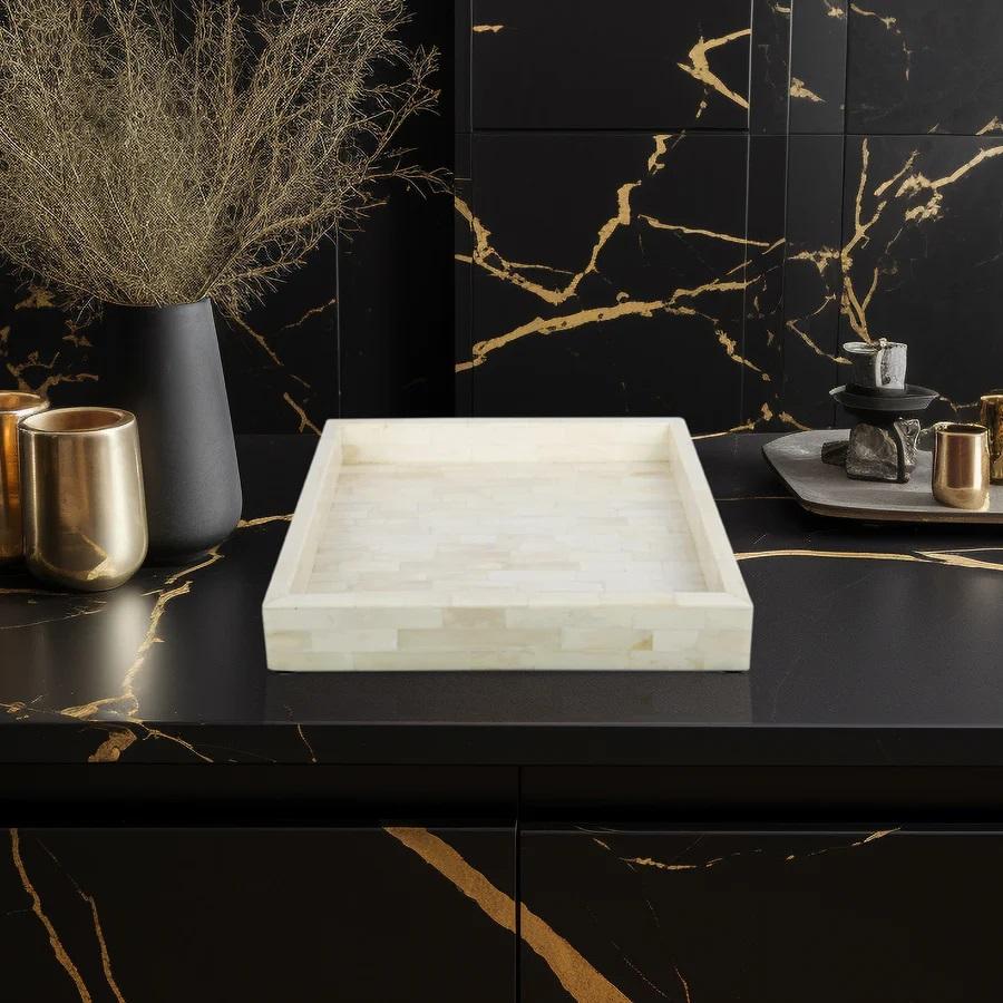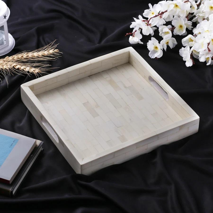 ถาดเสิร์ฟอาหารฝังกระดูกทรงสี่เหลี่ยมและสินค้าบาร์พร้อมถาดหูหิ้วสำหรับอุปกรณ์เสริมในบ้านงานฝีมือจากธรรมชาติ