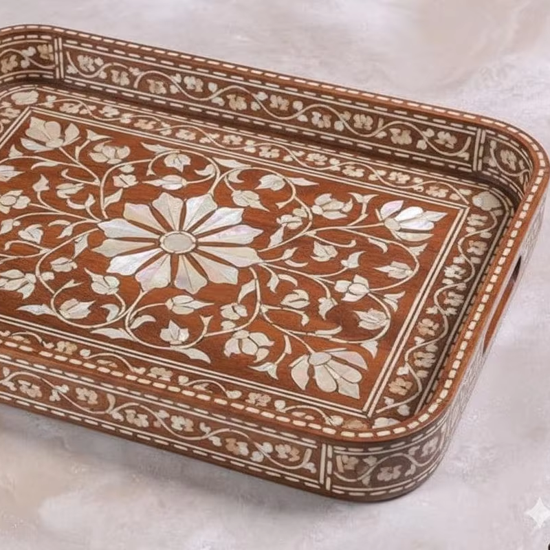 ถาดฝังมุกจากอินเดีย รูปทรงสี่เหลี่ยมผืนผ้า สำหรับเสิร์ฟอาหารในครัว ผลิตจากมุกแท้